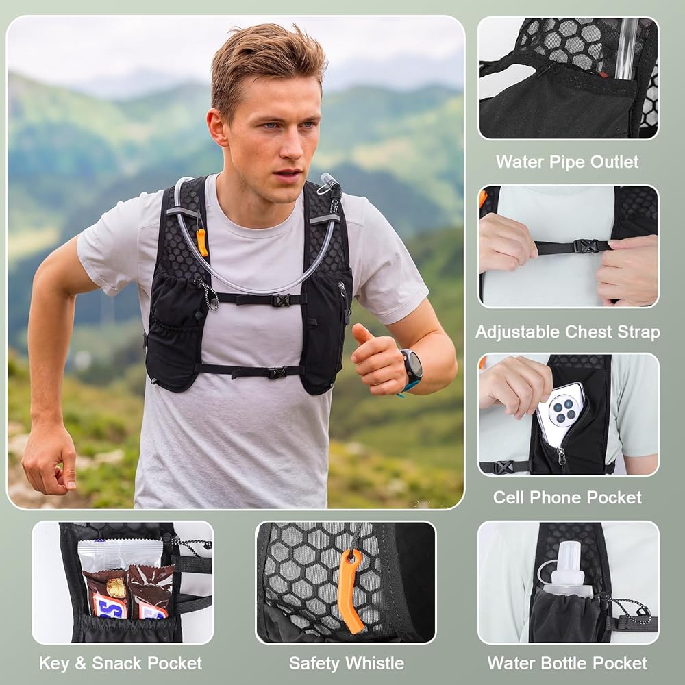 【ERGONOMIC BREATHABLE COMFORT】- Breathable mesh fabric enhances air circulation for fast heat dissipation and sweat wicking. Fully adjustable shoulder, chest and waist straps provide a personalized fit for this hydration pack, keeping you cool and comfortable during long workouts.