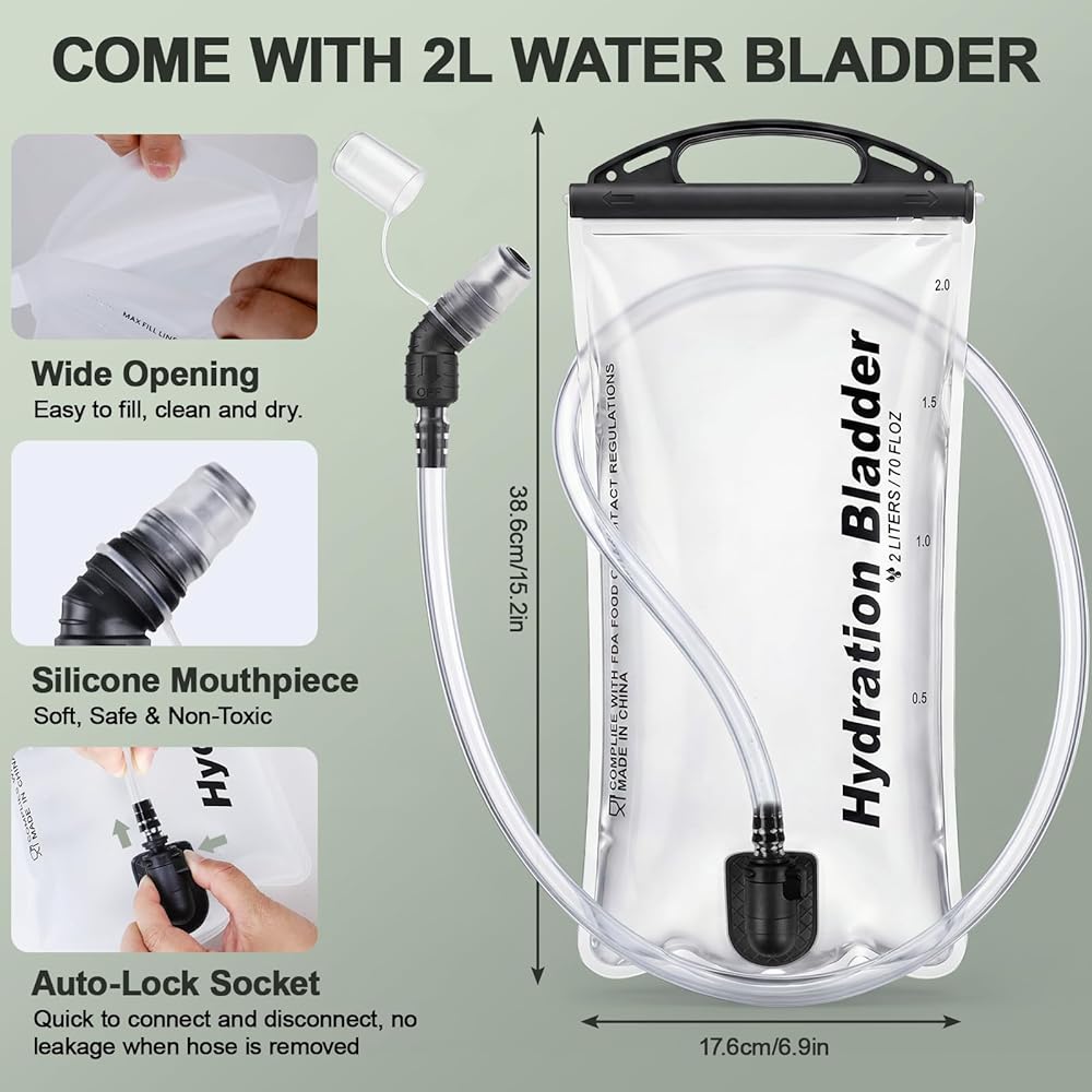 【2L FOOD-GRADE WATER BLADDER】- This water pack backpack is equipped with a 2L food-grade PEVA water bladder, BPA-free for safe and healthy drinking. The high-flow bite valve allows easy drinking on the go.