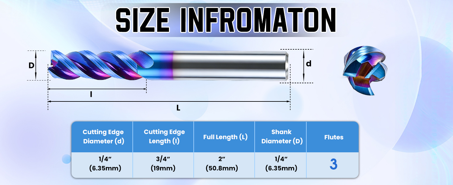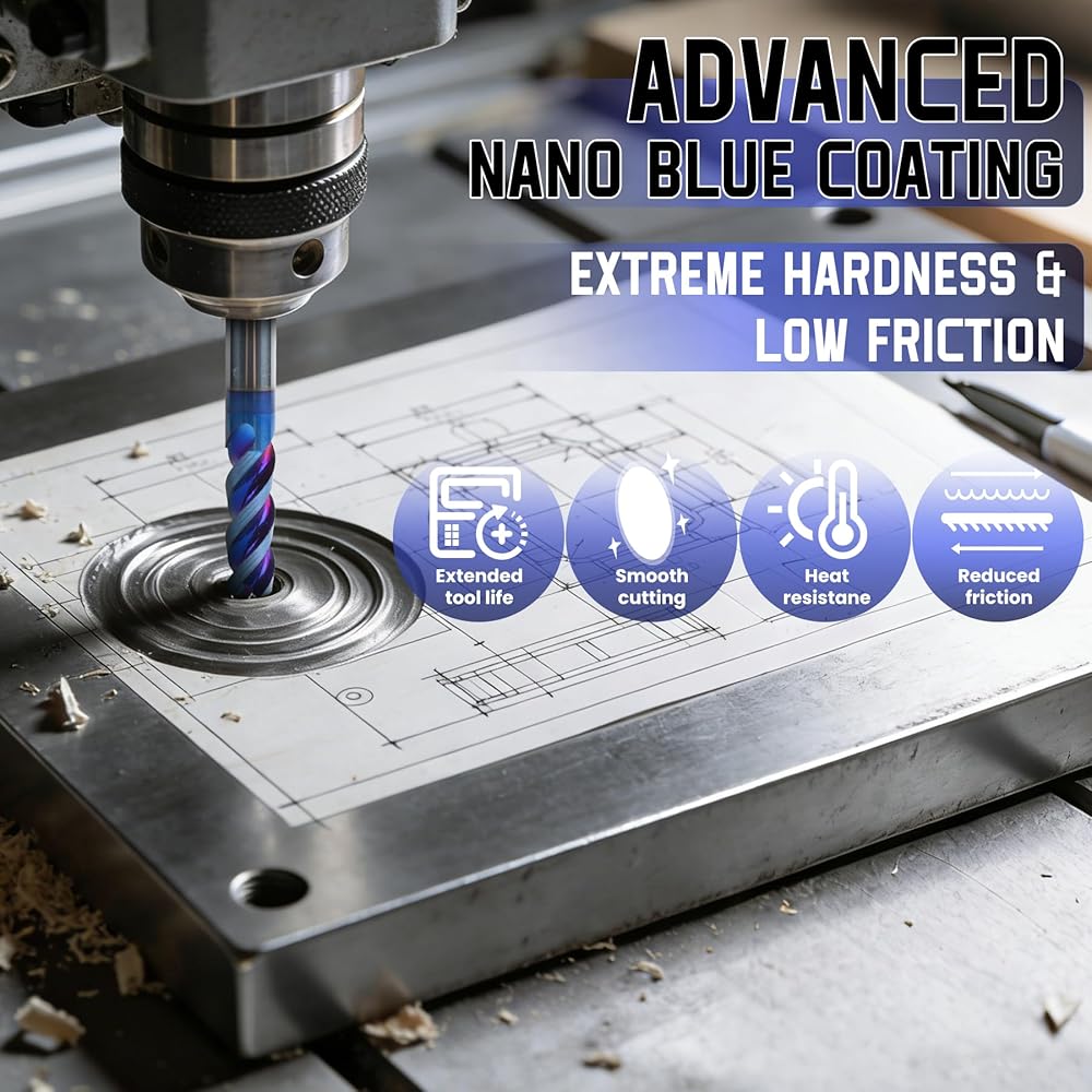 Advanced Coating & Ultra-Hard Material: This carbide end mill features a 3-flute design combines a Nano Blue coating with HV7000 hardness and an ultra-low friction coefficient (μ=0.08-0.15) for supreme wear and adhesion resistance. The core is made from HRC 60 ultrafine grain tungsten carbide, offering an optimal balance of toughness, hardness, and durability for a dramatically extended tool life.