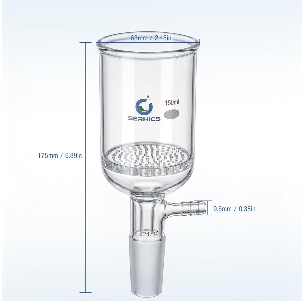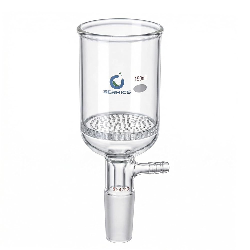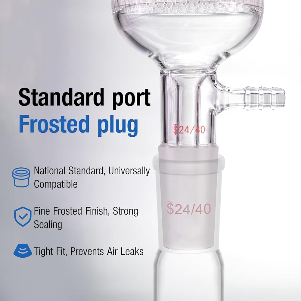 The glass micro-porous filter plate is designed with borosilicate glass, making it easy to clean and ensuring effective filtration each time. The funnel's conical design ensures an even liquid flow rate, reducing blockages during the filtration process
