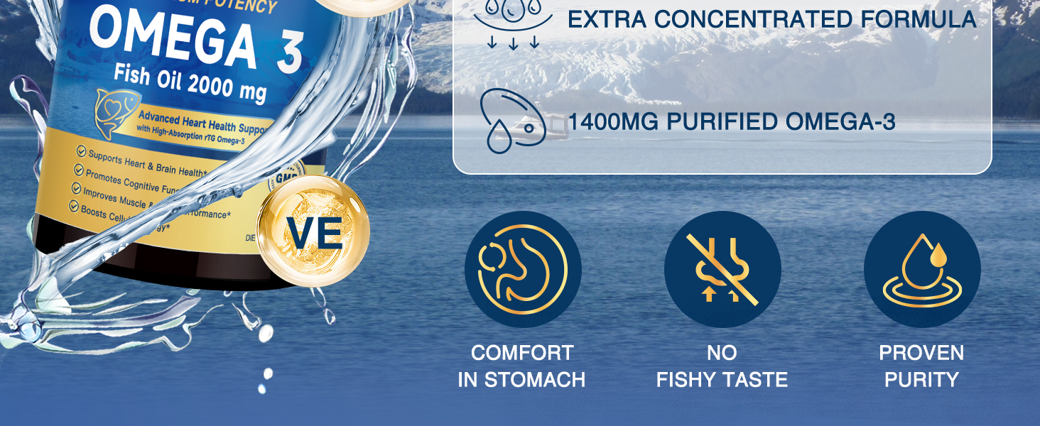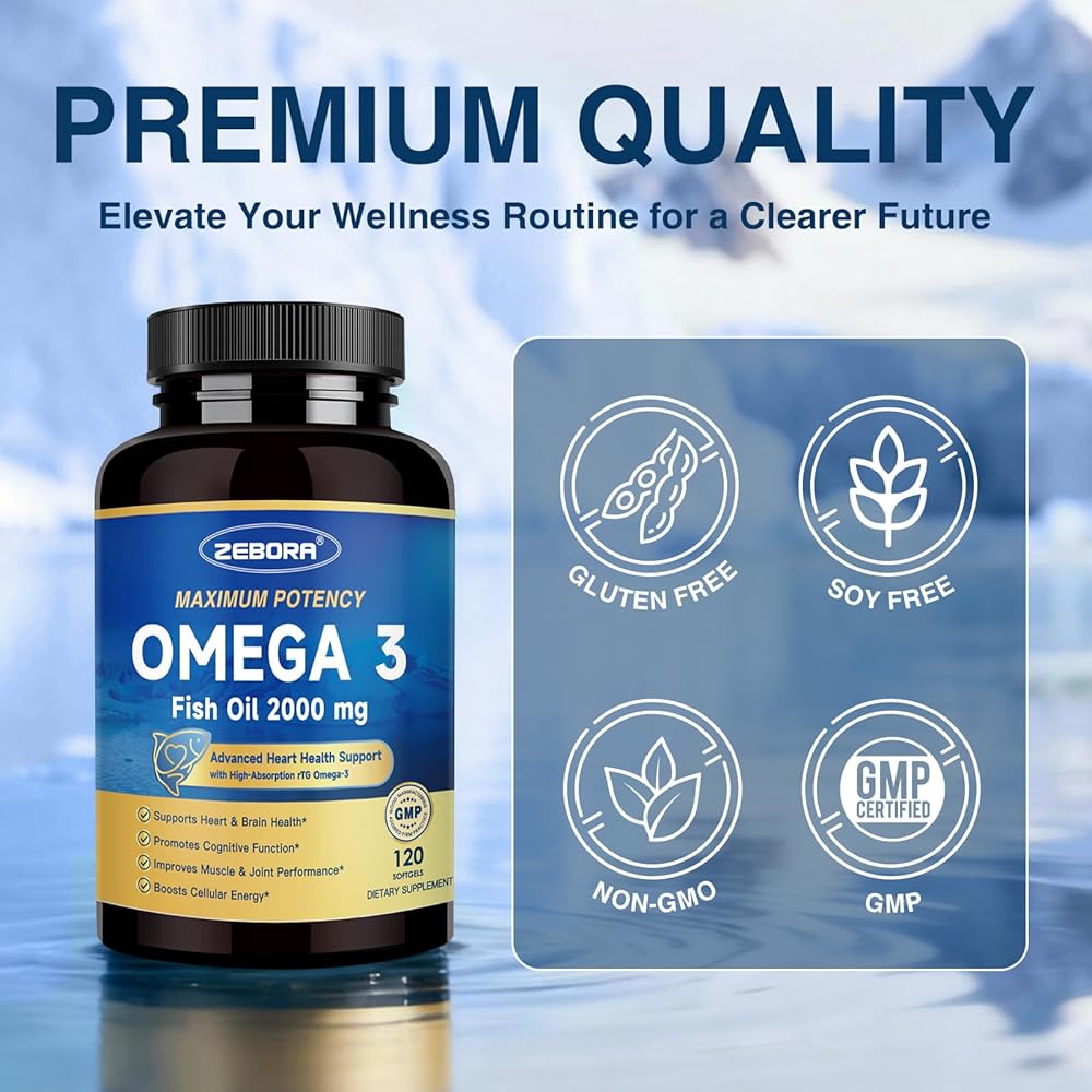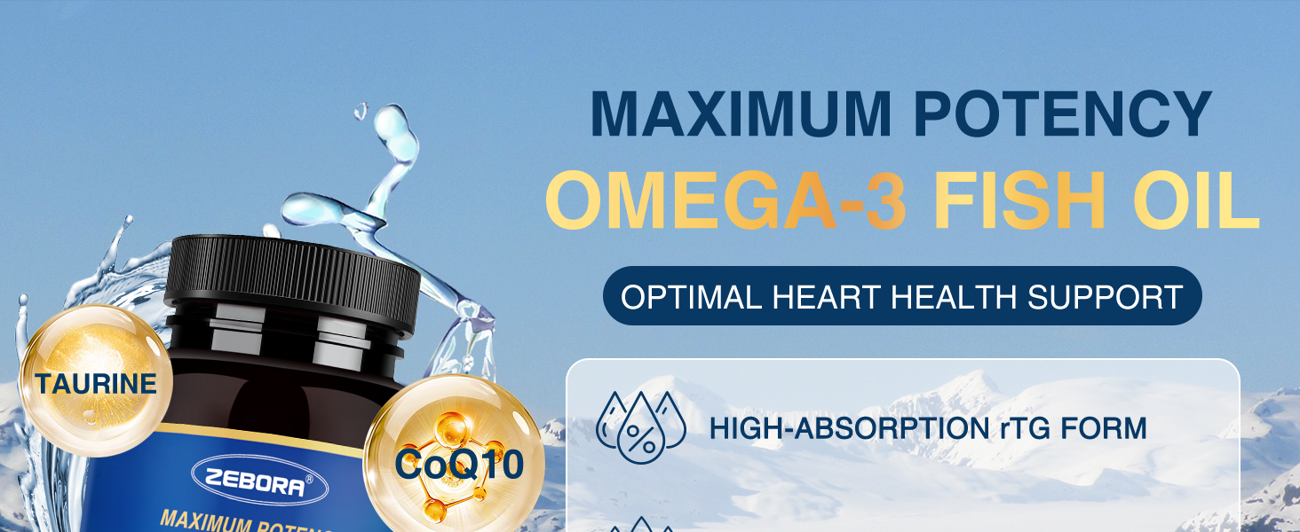 High Potency Fish Oil: ZEBORA fish oil supplement provides a high content of Omega 3 fatty acids for your body's health. Each 2-softgel serving of this fresh fish oil contains a golden 2:1 ratio of 800mg EPA and 400mg DHA in highly absorbable rTG form, combined with CoQ10, Taurine, and other multiple nutrients to support heart, brain, and Immune health.