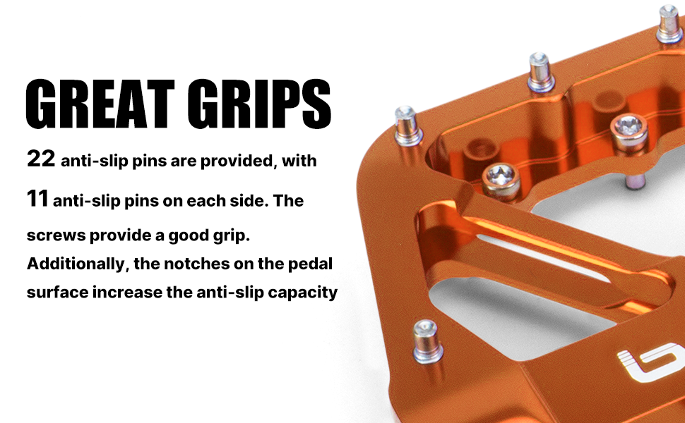 WIDE TREAD & GREAT GRIPPY: wide mountain bike pedals fit most shoes. Non-skip bicycle pedals w 9pcs replaceable & adjustable Pins per side, can grip shoes very securely.