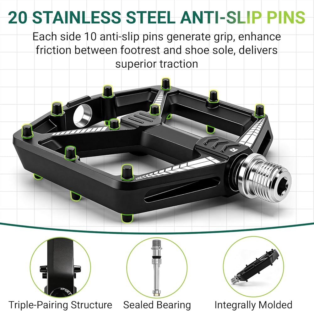 Anti-Skid & Great Grips: Feature an aluminum base and are equipped with 10 stainless steel anti-slip studs on both sides. The slightly concave surface ensures a snug fit against the bike frame, to eliminate foot slip—even in mud, rain, or rough terrain. You get the security of clipless pedals with the freedom of flats.