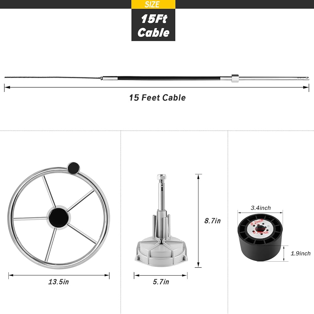 Complete Accessories: The boat steering cable control cable kit comes with a 13.5 in stainless steel steering wheel, swivel rudder, 15ft of steering cable, hardware, 90-degree baffle kit, and standard 3/4'' tapered steering shaft