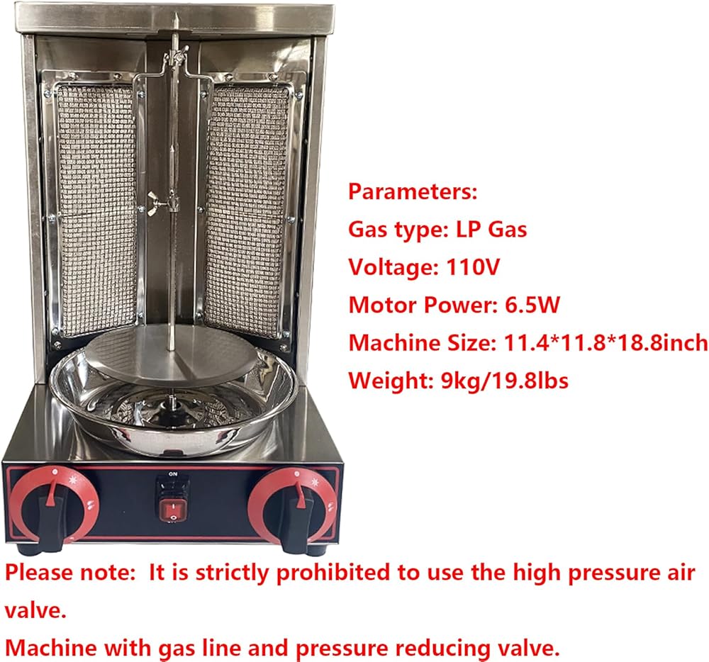 LP Gas and Electric Control: The vertical grill machine is powered by LPG, making it easy and safe to operate. It also requires 110V power to control the rotisserie. Please note: The machine comes with gas line and pressure reducing valve; the use of high pressure air valve is strictly prohibited