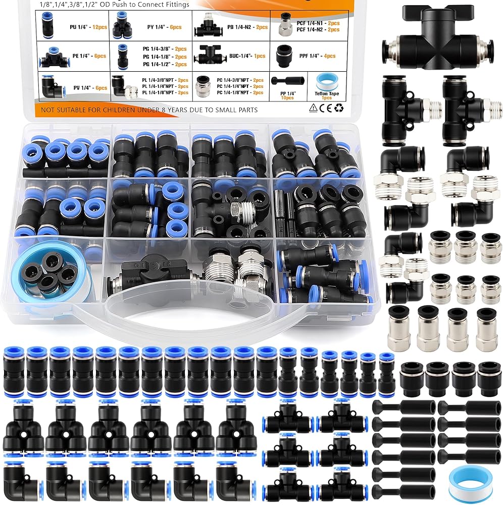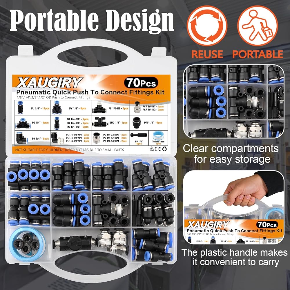 • Include:It includes 70 pcs of 1/4" size 20 different pneumatic accessories,such as straight union connectors,tee unions,90°elbows NPT thread,teflon tapes,etc.They are neatly organized in a box,with clear divisions for easy use,and can meet your various usage needs.