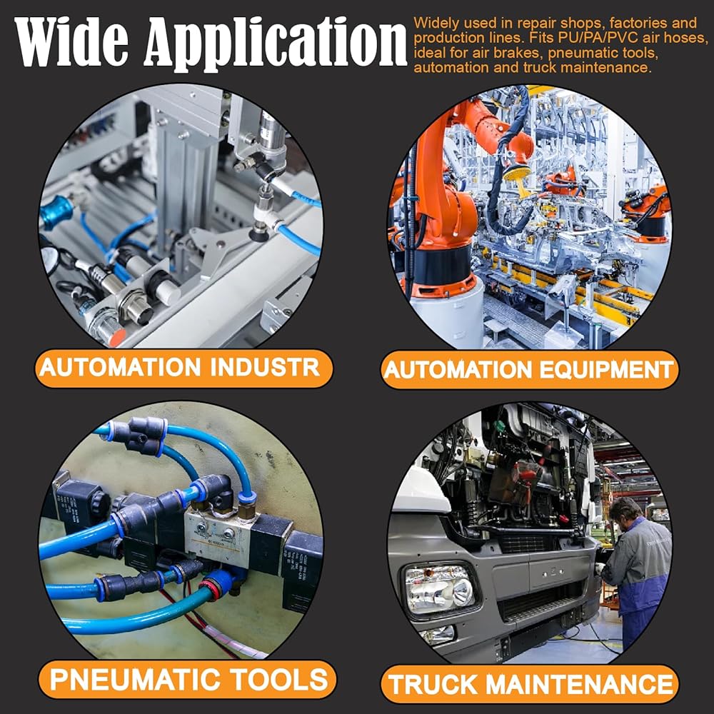 • Wide Application:It is widely used in automotive repair shops,factories,manufacturing production lines,etc.Air hoses that can be used to connect PU,PA,PVC materials,suitable for air brake systems,pneumatic tools,automation equipment,truck maintenance,etc.