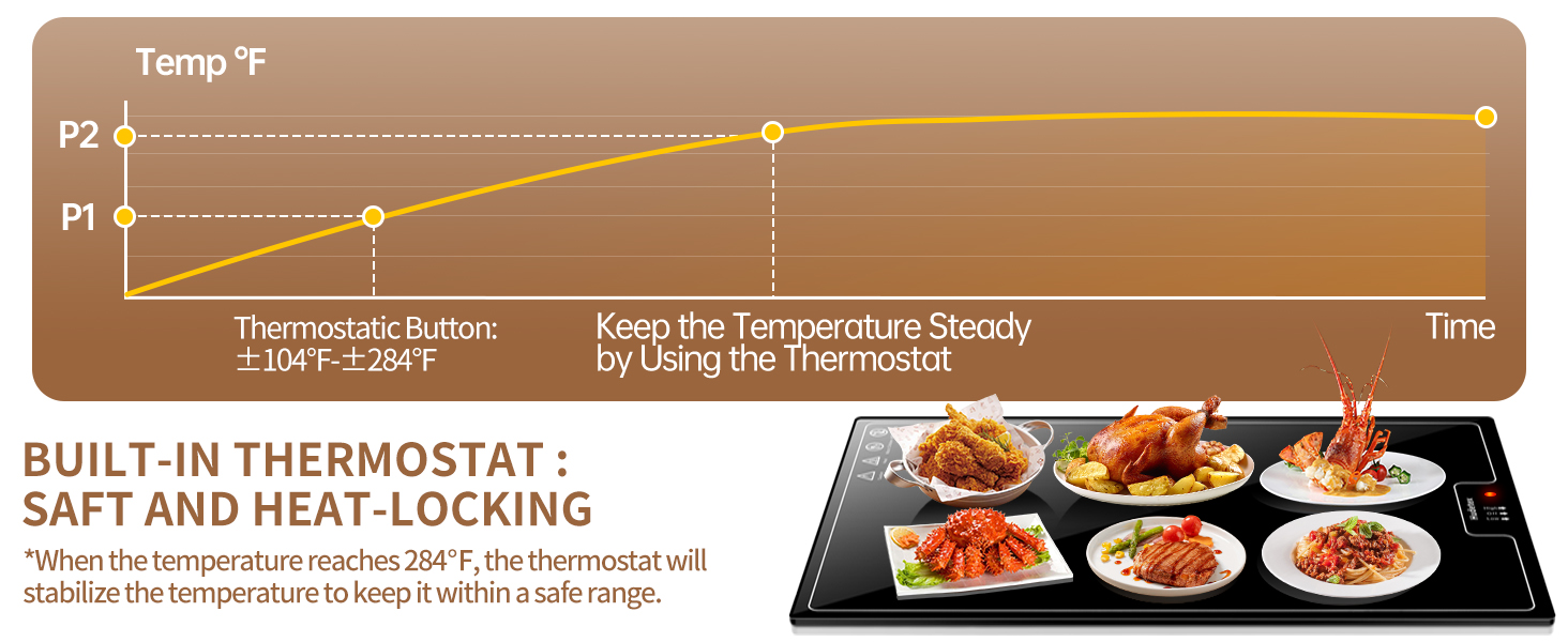 Two Temperature Modes : Out food warmer has two heating modes(±104°F/±284°F) and suitable for all seasons. Unlike other food warmers, ours has an internal thermostat,when the temperature reaches 284°F, preventing it from continuing to rise.It can eliminate any danger and let you use it with confidence.