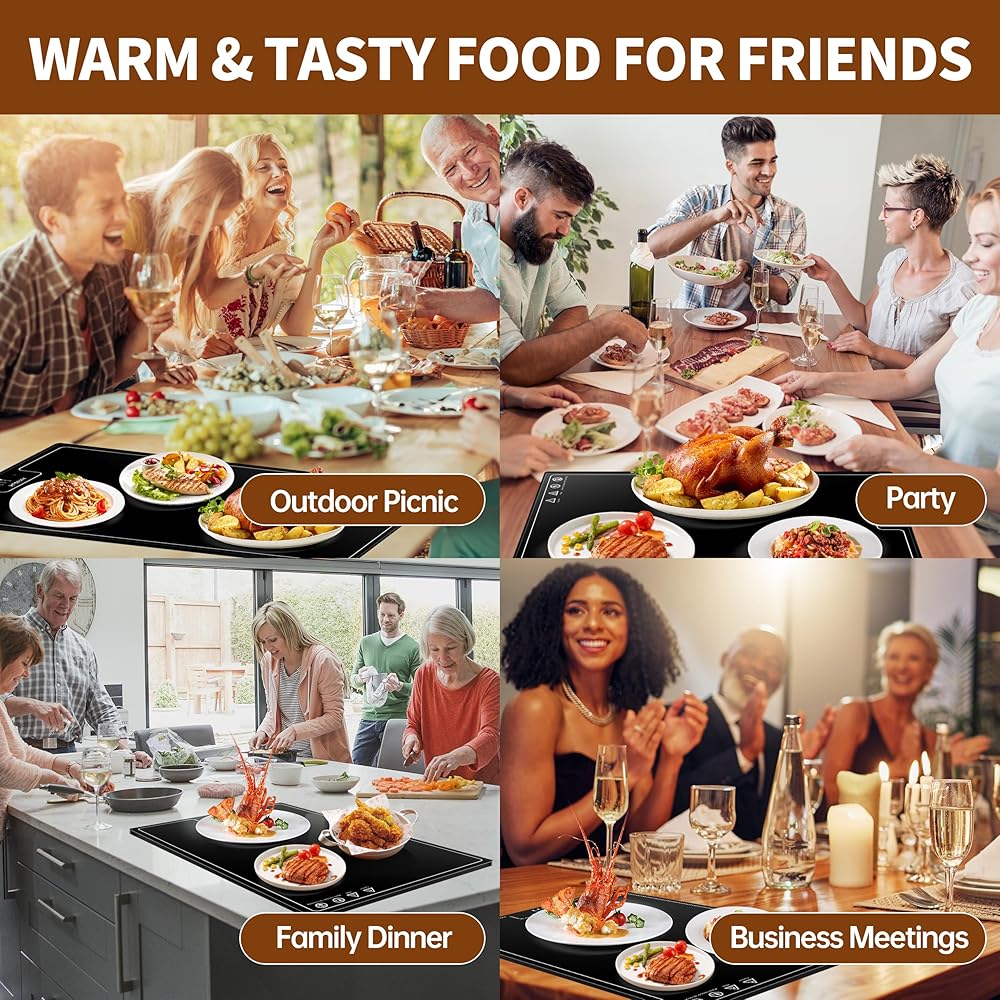 Experience Even and Fast Heat Distribution: Full surface and large area heating, fast and even heating. Electric warming tray carefully designed the heating method of heating wire + heating film to ensure even heat distribution, allowing you to place the tableware freely.