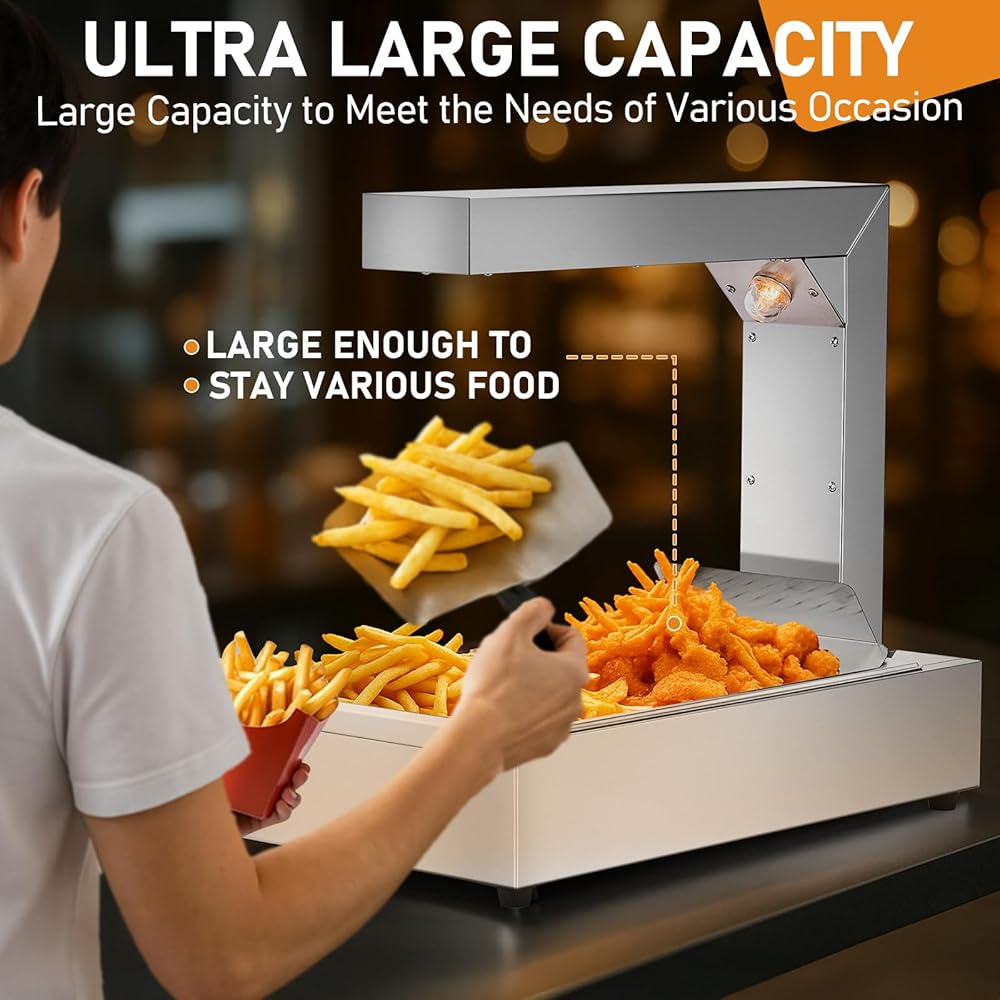 Reliable performance: The food warmer lamp is made of high-quality stainless steel, offering excellent corrosion resistance for long-term use. Its 750 W high-power design ensures rapid and even heating.Keeps fries crispy and fried foods at the perfect serving temperature, preventing overcooking or sogginess.
