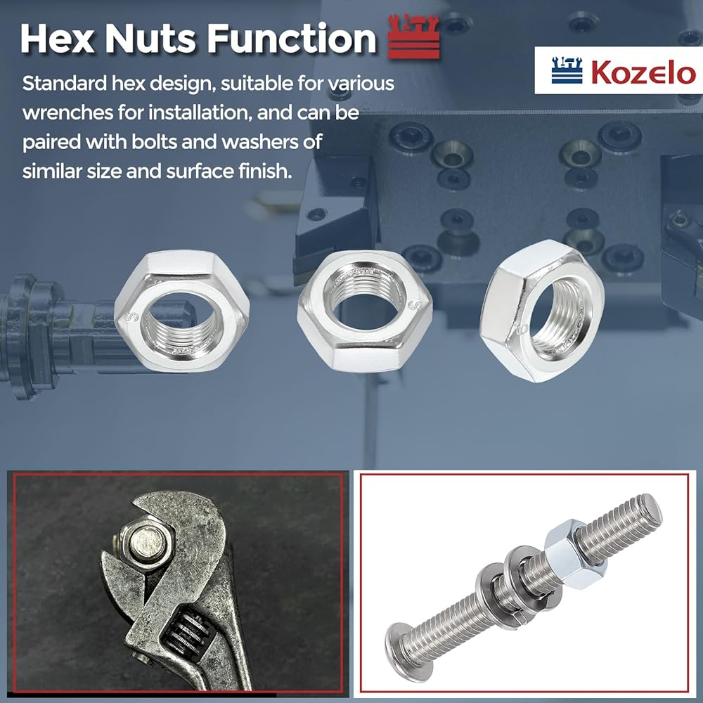4- DURABLE USE - Hex nuts feature wide applicability and deliver strong fastening force. With their standard hexagonal design, they can be easily installed and used with the right wrenches and hardware in daily applications. The precisely machined threads ensure proper engagement with bolts, enabling smooth and secure tightening.