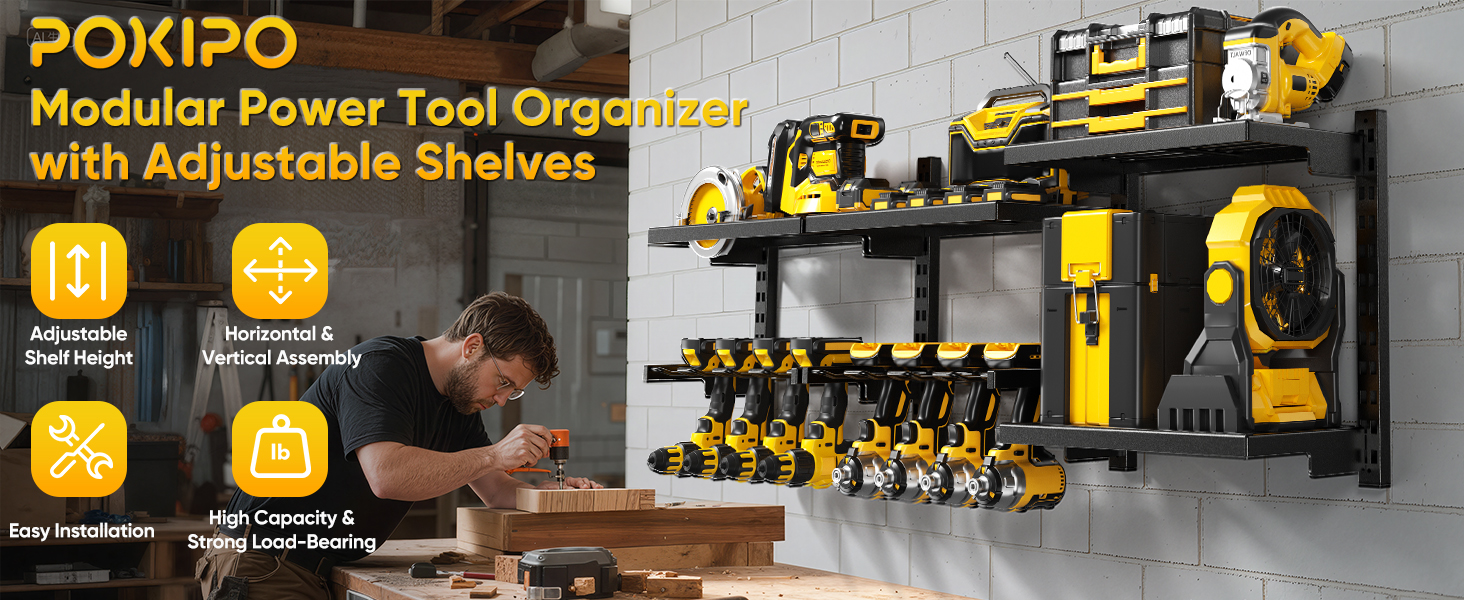 POKIPO Large Modular Power Tool Organizer Wall Mount With 6 Adjustable Shelf, Heavy Duty Iron Tool Storage Rack Loads 300lbs with 8 Cordless Tools Drill Holder,Battery Utility Rack for Garage Workshop