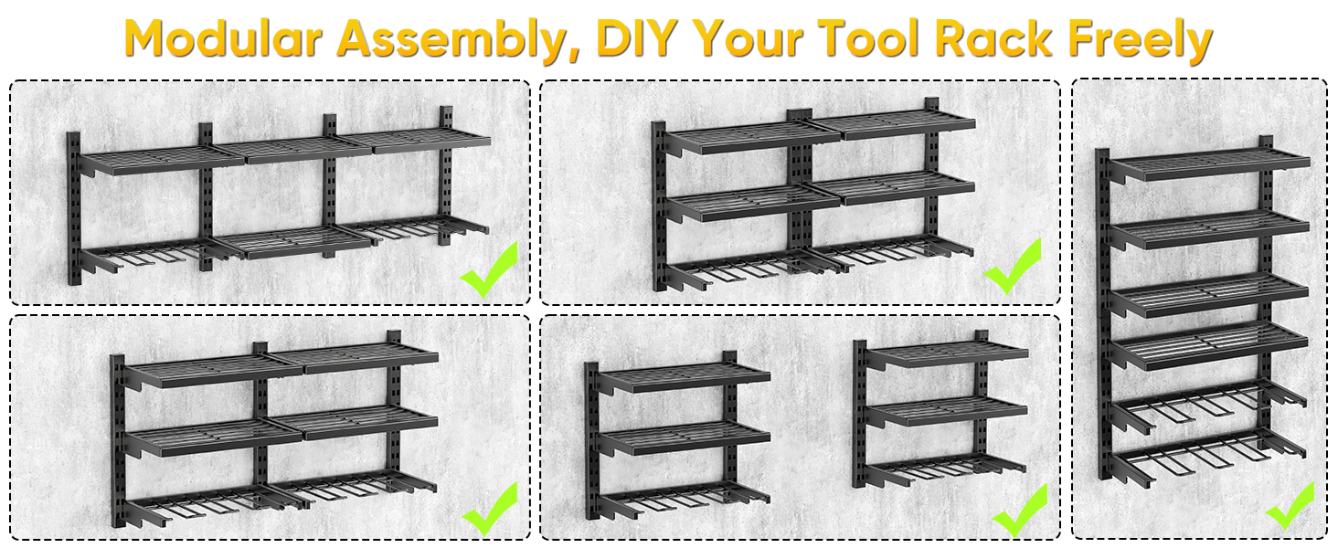 Six-Tier Modular Design for Customized Organization: This six-tier wall-mounted tool rack can be assembled in three ways—horizontally into two rows, vertically into six layers, or split into two three-tier units. Its modular design fits any tool room, big or small, allowing you to DIY your perfect storage solution.