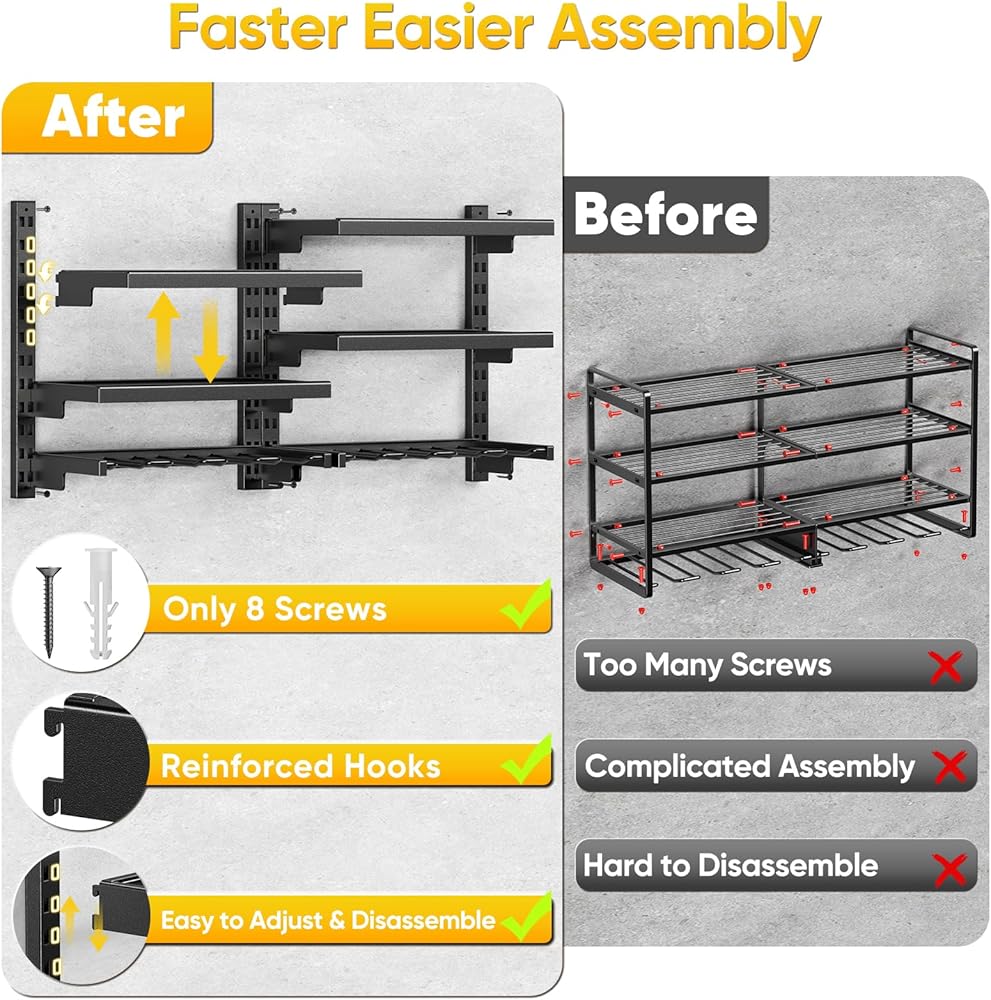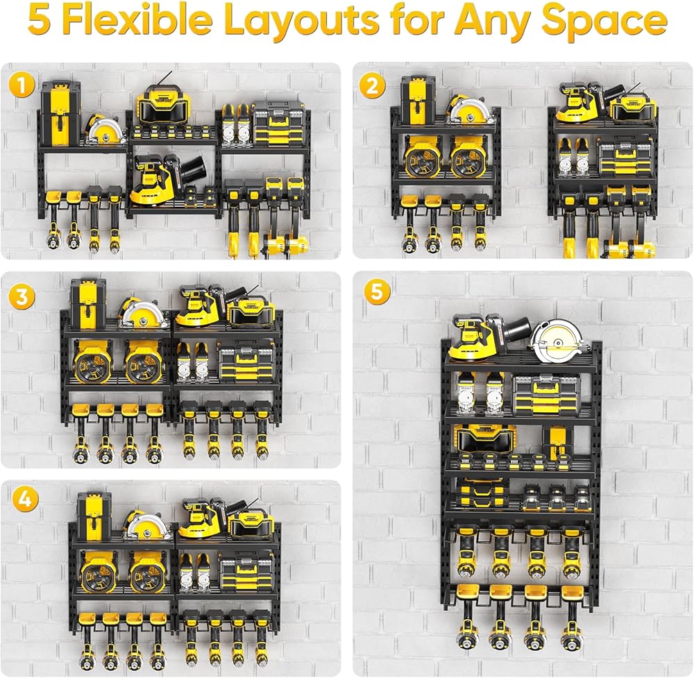 Adjustable Shelf Height for Flexible Storage: Our tool holder features freely adjustable shelf spacing, accommodating tools of all sizes with ease. Unlike fixed models, it offers unmatched flexibility, effortlessly organizing toolboxes, drills, chargers, and more.