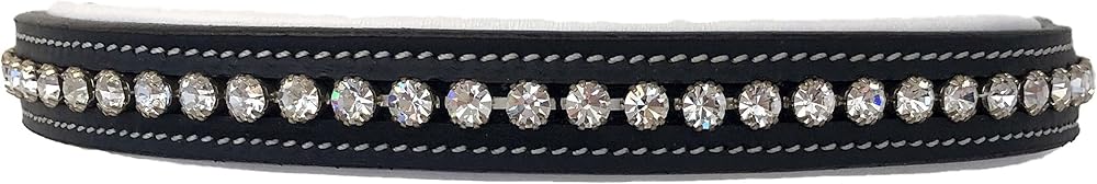 White leather padded browband with clear crystals for English bridles. Soft and pliable leather with white padding. Featuring a clear round crystal accent. Available in 4 sizes and two colors of leather.