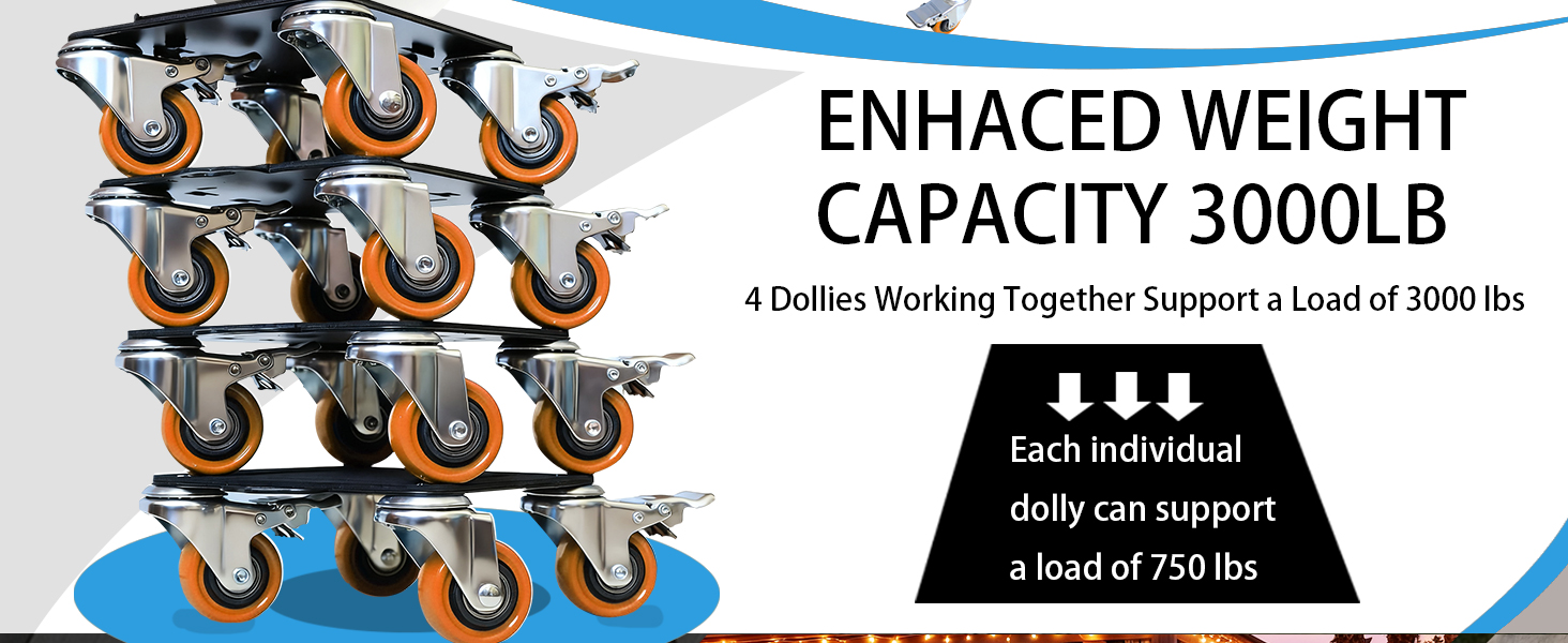 【Robust Steel Plate Construction】Crafted from reinforced carbon steel, SAPITER furniture moving dollies are built for exceptional strength and long-term use. 4 dollies working together support a load of 3000 lbs (Each individual dolly can support a load of 750 lbs). These dollies are ideal for transporting a wide range of heavy items such as sofas, pianos, beds, tables, safes, wardrobes, washing machines, and appliances