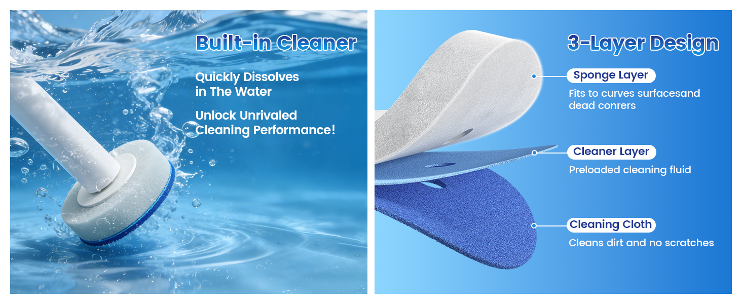 Upgraded Toilet Wand Refills: The three-layer design of the disposable toilet brush heads consists of a sponge, a cleaning pad, and a scrubbing cloth, this design retains more foam and generates increased friction, tackling tough stains more effectively than standard double-layer sponges.