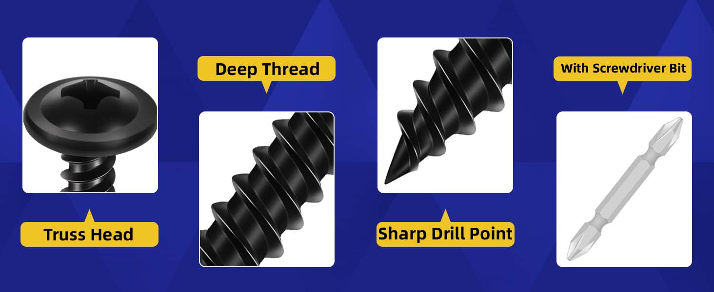 PACKAGE: 120 PCS Truss head fast self tapping screws, including 3 sizes, each size has 40 pieces, and an extra cross drill bit.