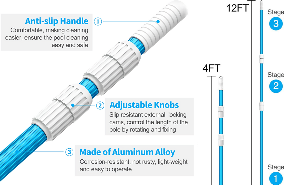 PROFESSIONAL GRADE POLE - Durable and sturdy professional 12 foot 1.0mm Commercial Thickness blue anodized aluminum telescopic swimming pool pole.Extend pole from 4 ft - 12 ft Clean your pool from every angle