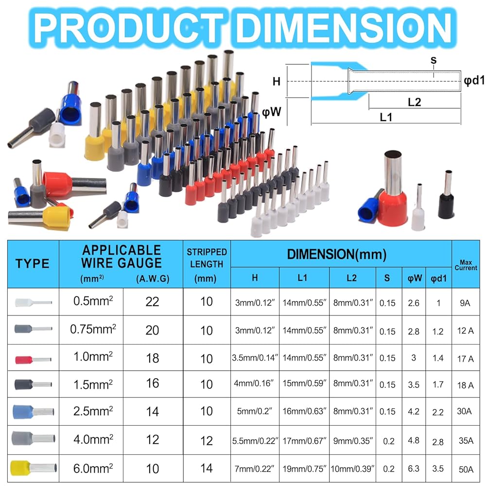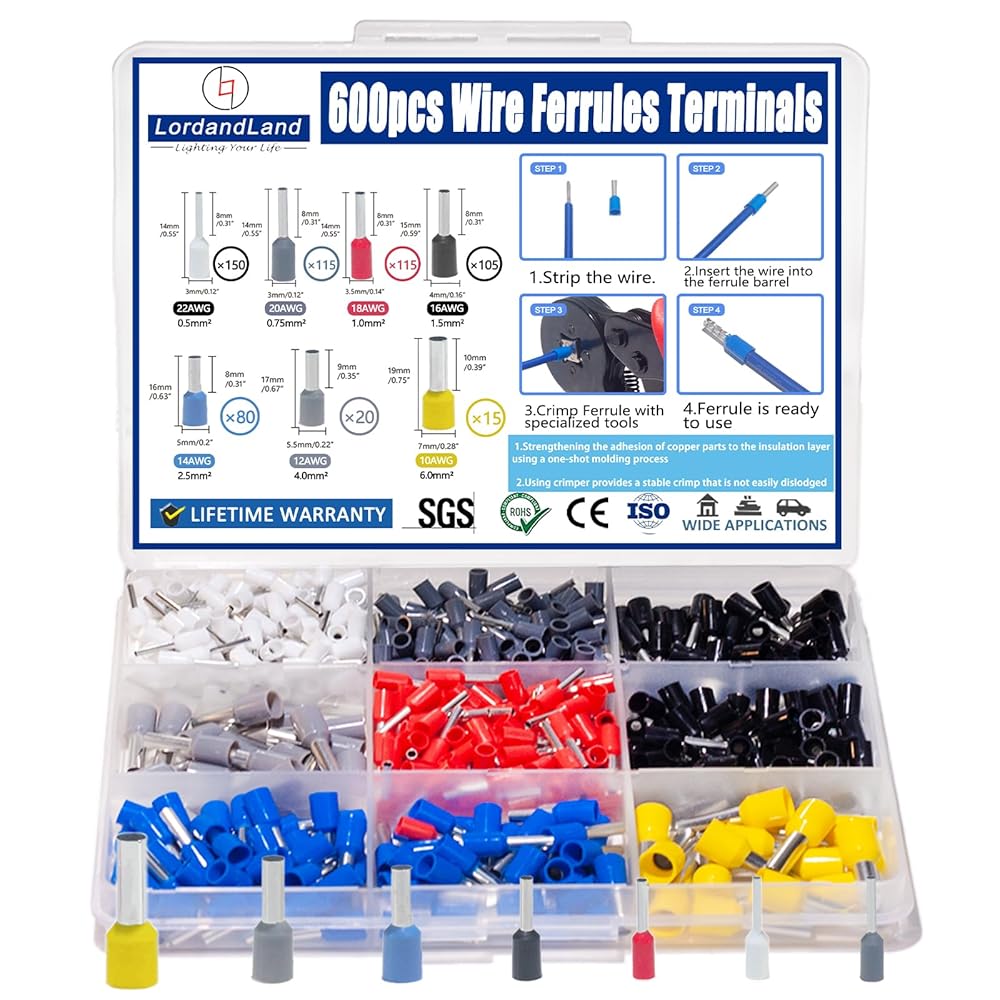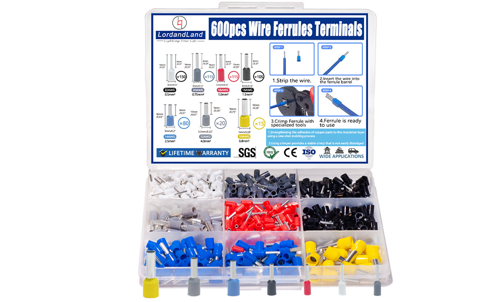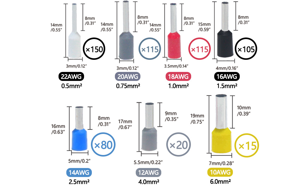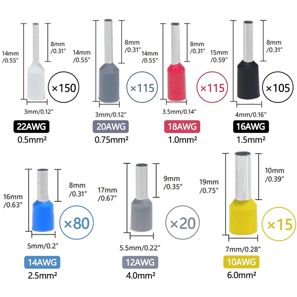 7 Size / 600 PCS Ferrule Terminal Kit : 7 colors, 7 sizes, meet the requirements of WAG22-10 specification wire, 600PCS wire ferrule terminals will last for numerous wiring projects.