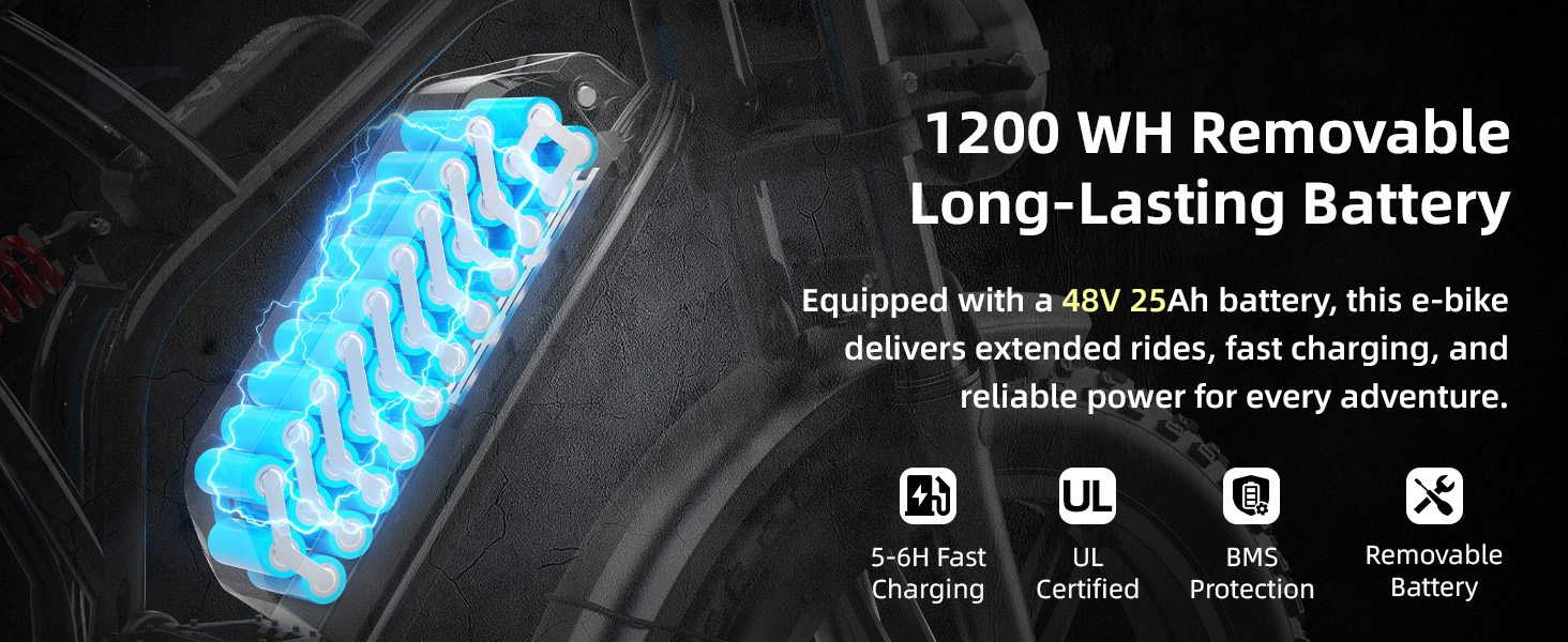 【Extended Riding Range with Modular Battery Options】The S20 electric bike supports 48V removable battery configurations (13Ah / 20Ah / 25Ah), allowing riders to choose the range that fits their lifestyle. Expect up to 35 miles in throttle mode or 60+ miles with pedal assist, with higher-capacity options reaching 80–120+ miles. Detachable design enables easy indoor charging in about 5–6 hours.