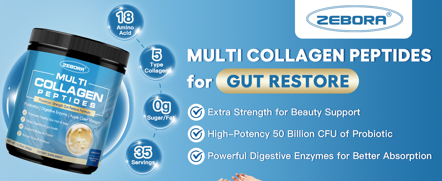 ZEBORA Multi Collagen Peptides Powder with Probiotic for Gut Health, Hydrolyzed Collagen with Digestive Enzymes, Prebiotics for Women, Support Digestive Health, Skin, Hair, Joints, Non-GMO,35 Servings