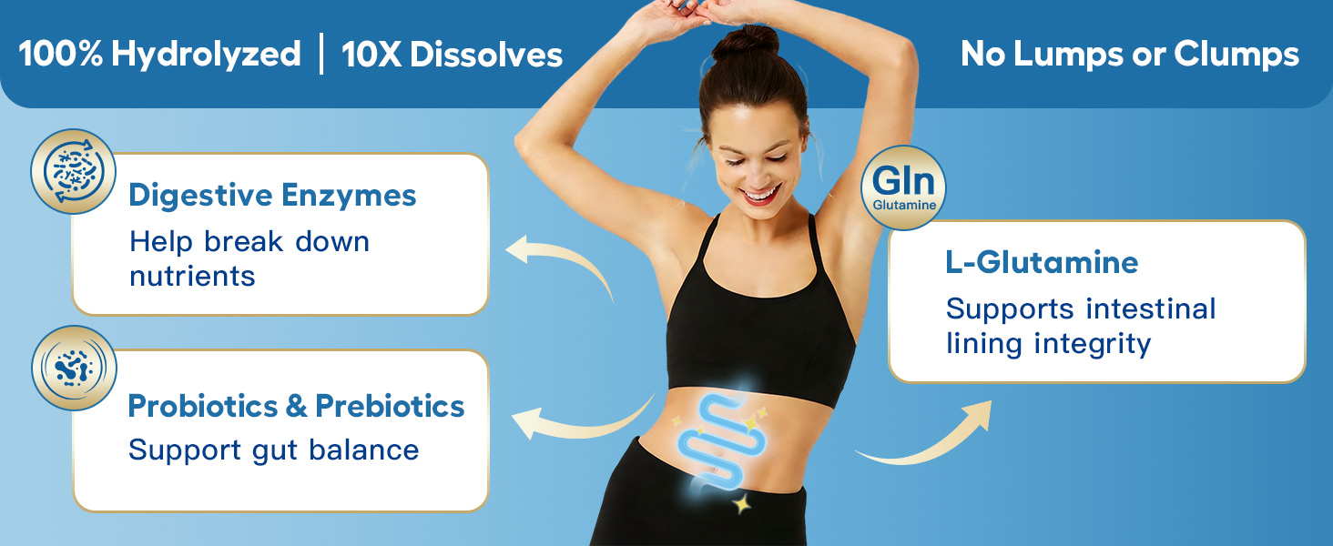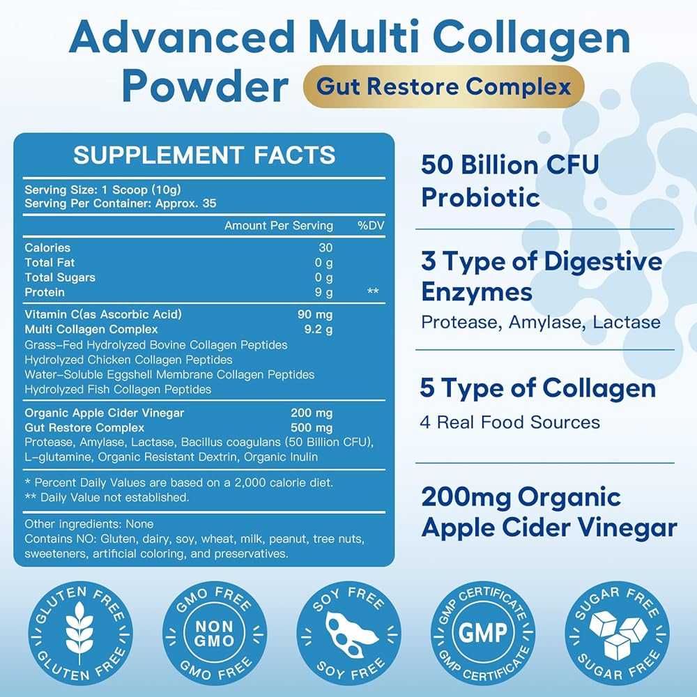 UNLEASH YOUR INNER RADIANCE TODAY - Revitalize your gut & skin from within with an advanced gut restore blend and collagen powder that nourish your beauty globally. Our collagen peptides feature types I, II, III, V & X collagen, sourced from grass-fed cows, chicken, wild-caught fish & eggshells and enriched with probiotics, digestive enzymes & vitamin c, which promotes healthy hair & strong nails, improves gut function & digestion, supports joints mobility and assists in bone strengthening.