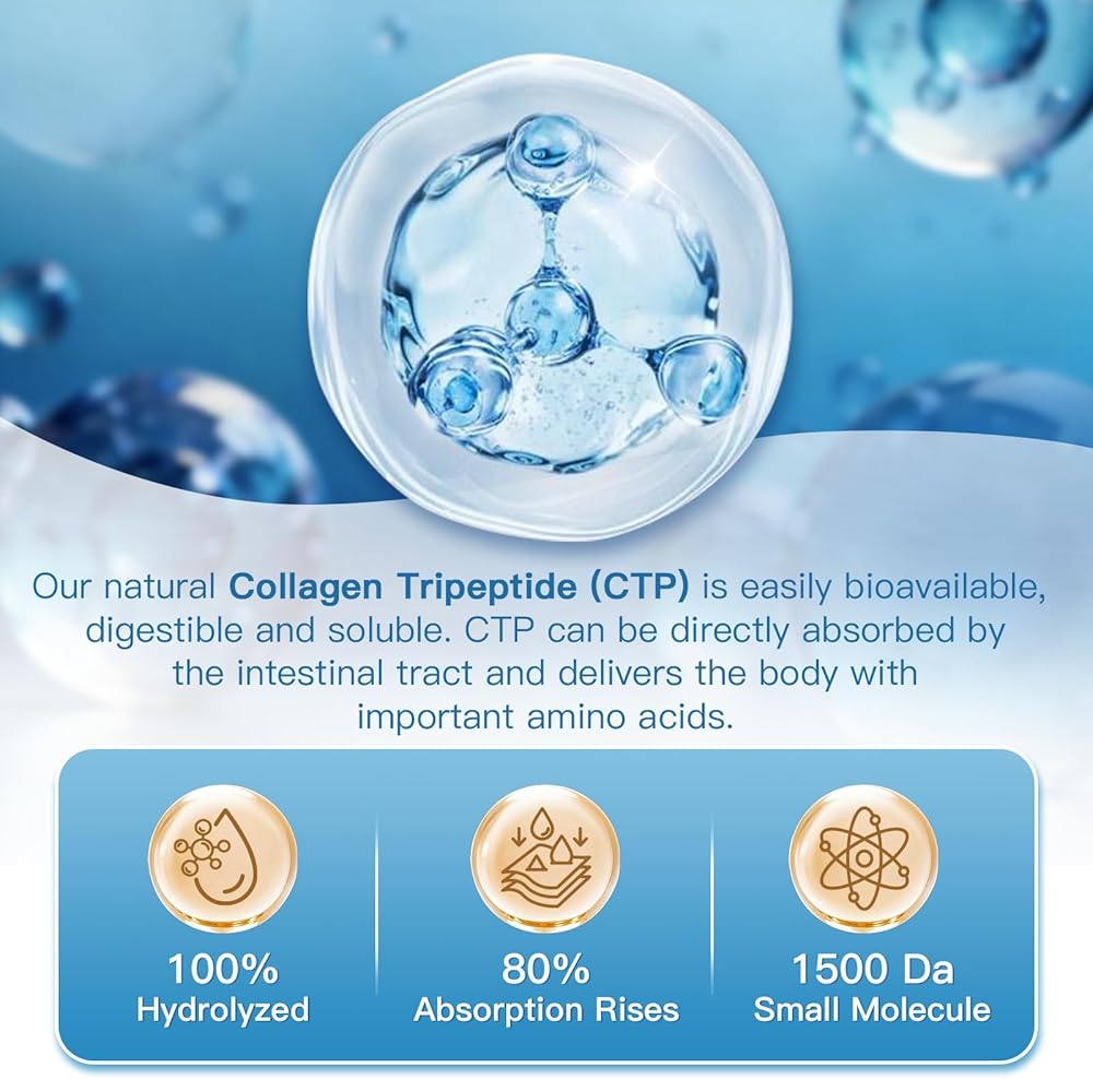 ENHANCED DIGESTION & NUTRIENT UTILIZATION - Our natural Collagen Tripeptide (CTP) is easily bioavailable, digestible and soluble. CTP is the minimum unit of collagen consisting of 3 amino acids. CTP differs from conventional collagens - it can be directly absorbed by the intestinal tract and delivers the body with important Amino Acids. Our collagen peptides contain digestive enzymes & organic apple cider vinegar, which help your body digest the nutrients and decrease gas and bloating, making our collagen peptides powder better absorbed than other collagen supplements.