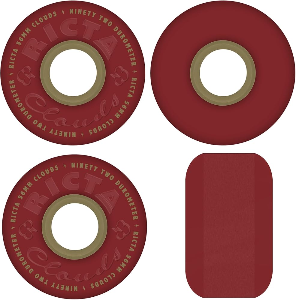 The Ricta Clouds Maroon with Gold 56mm, 92a wheels feature maroon urethane and metallic gold core, with debossed and pad printed lettering on a soft yet firm 92a urethane: perfect for filmer setups or skating rougher terrains.
