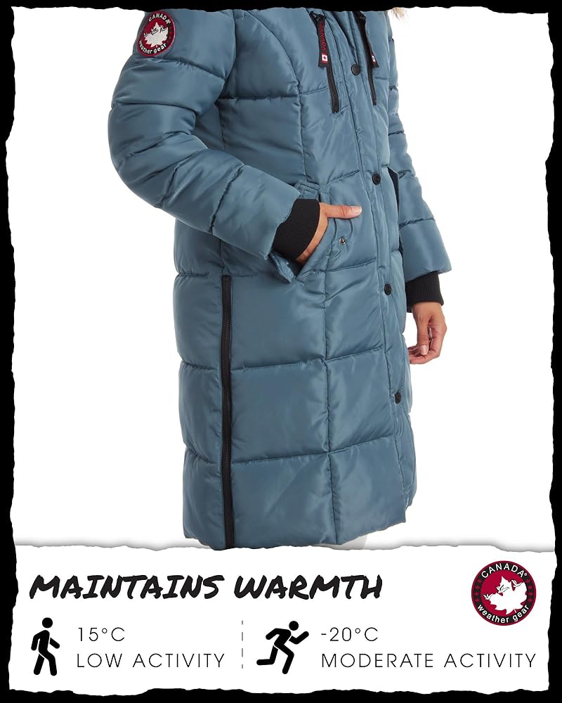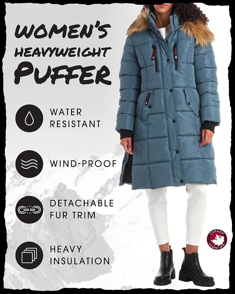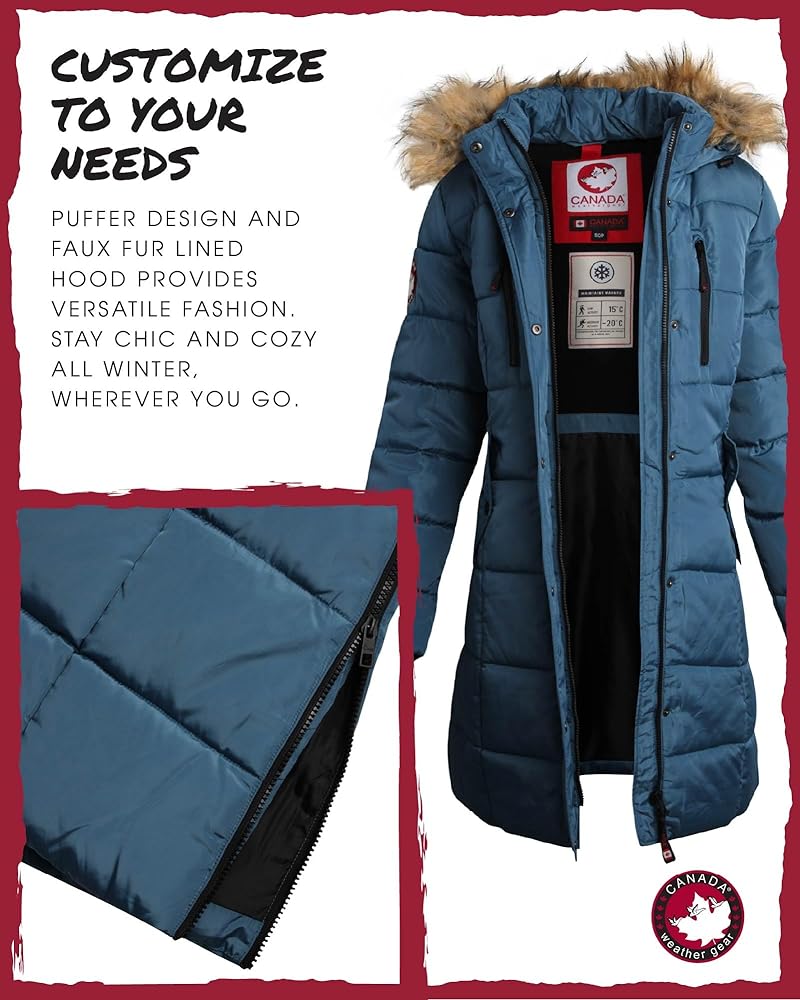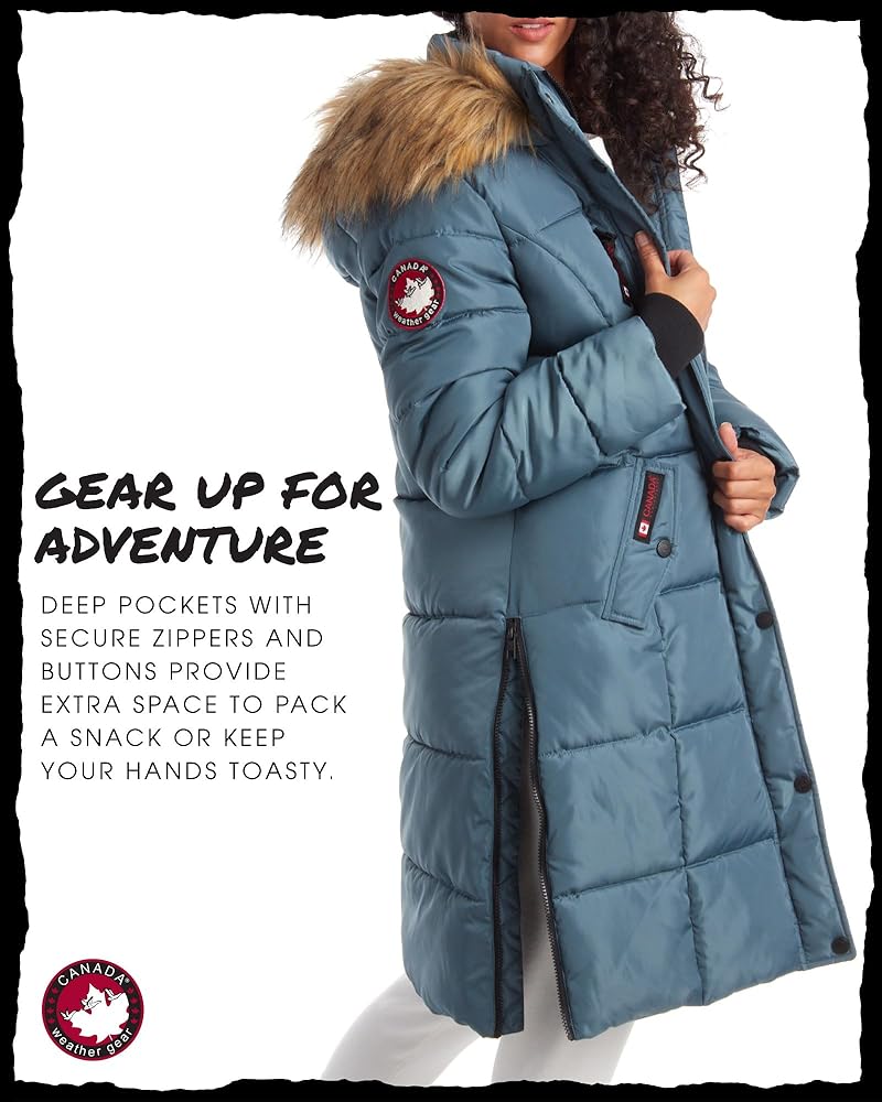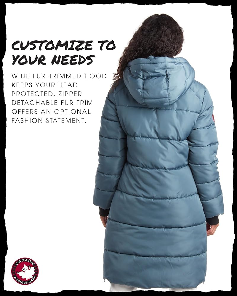 Canada Weather Gear Women's Long Bubble Jacket is the perfect way to get through winter. Generous coverage keeps your seat and legs warm, while the side zippers give you room to move when getting in and out of cars or climbing stairs. The removable fur on the hood frames your face with warmth when needed. You'll love all the pockets with plenty of space for your wallet and keys, and of course, chilly hands.