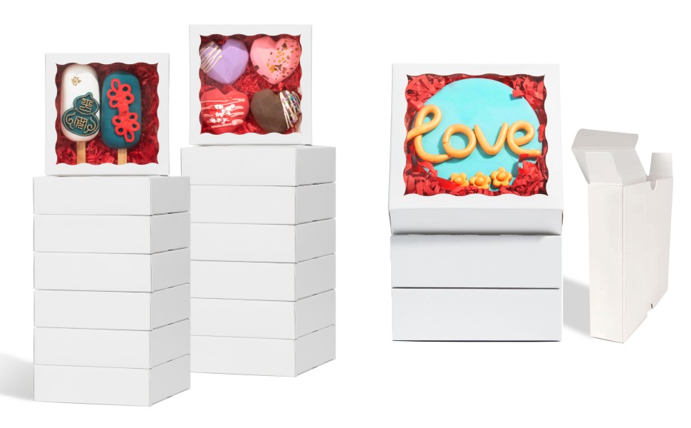 Romantic Baking 40 Pack 5" x 5" x 1 1/5" Cookies Tuck Boxes Heart Hot Chocolate Bombs Macaron Bakery Boxes with Window