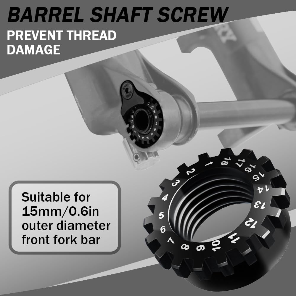 Material: 7075 aluminum alloy Weight: 6 grams Description: Suitable for FOX 32 34 36 using a barrel shaft rod front fork with a 15mm pitch of 1.5mm Package Includes: 1 x Front fork barrel shaft rod nut