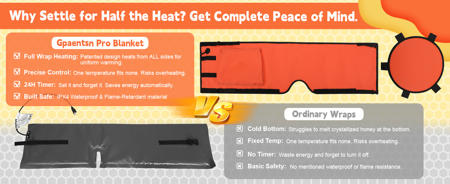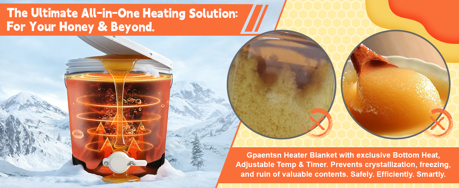 [Complete Decrystallization with Bottom Heat]: Unlike other honey warmers that only heat the sides, our beekeeping blanket features unique bottom heating technology, allowing for complete decrystallization. It ensures even heat distribution from all directions, effectively liquefying the stubborn crystallized honey at the bottom of the pail, saving you time and effort from stirring.
