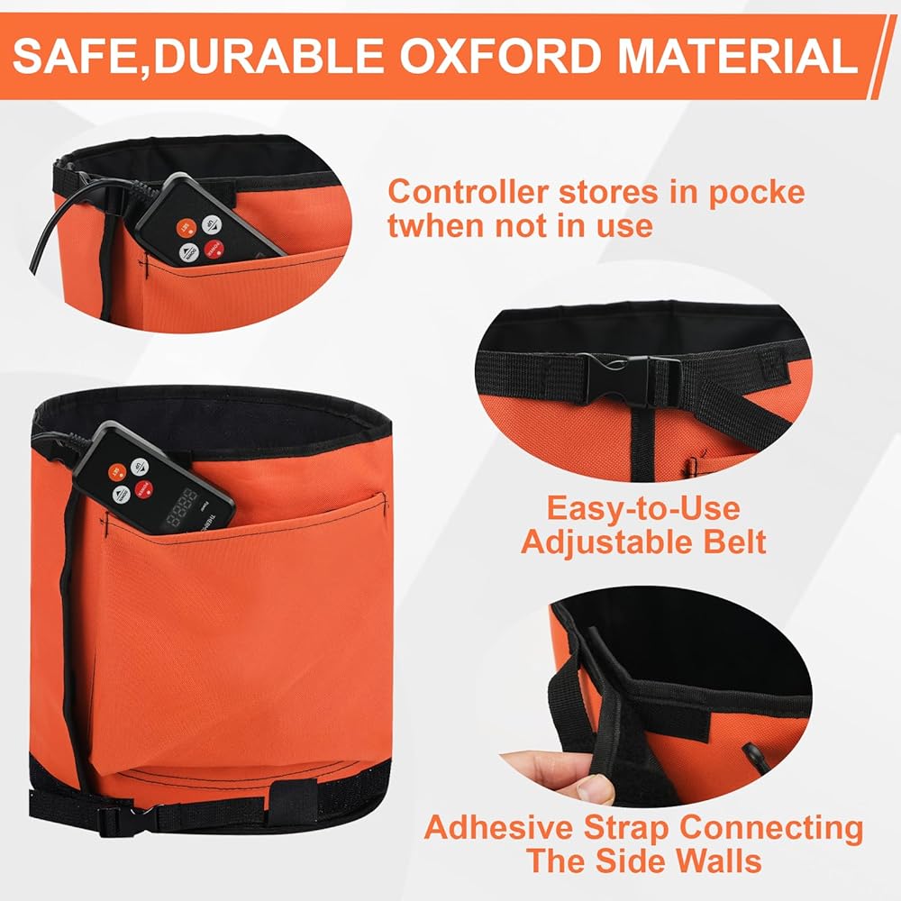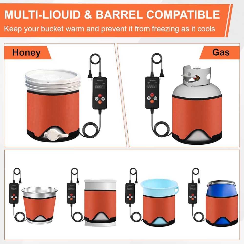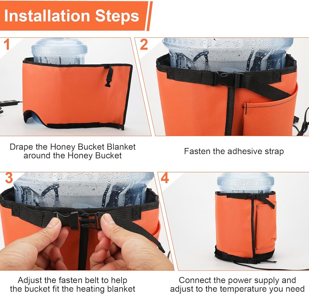 [Safer & Durable Construction]: Made of fire-retardant and IPX4 waterproof material, this bucket heater is built for safety and longevity. It resists water splashes and accidental spills, making it ideal for use in areas such as honey processing rooms, garages, or kitchens. The sturdy buckle ensures a secure and snug fit on standard 5-gallon pails (max. bottom diameter 30cm).
