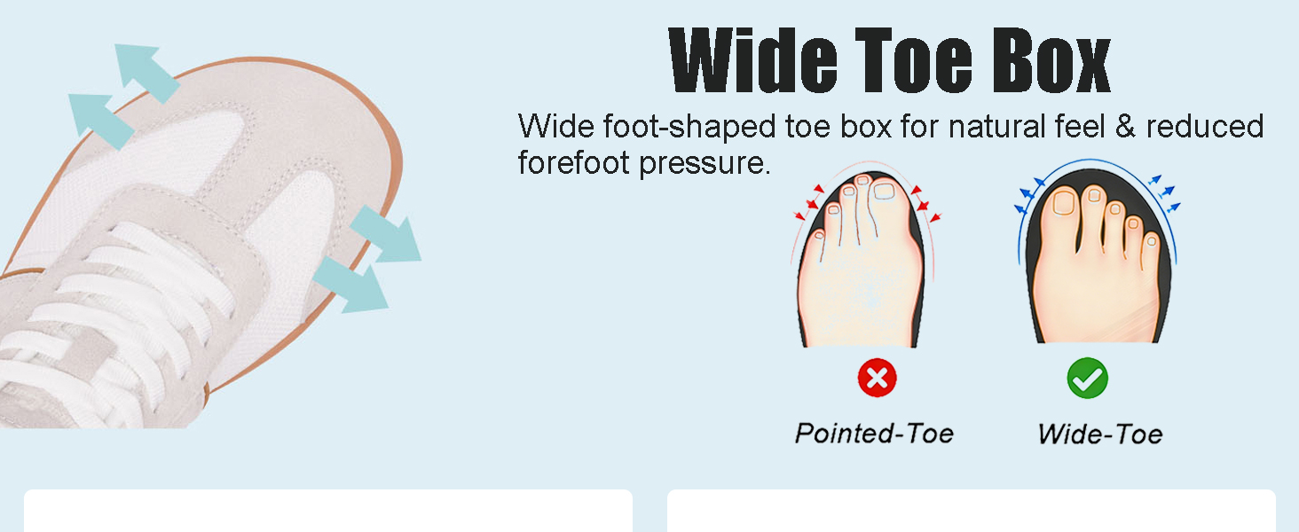 Wide toe box: Wide foot-shaped toe box design provides better traction and a more natural feel, while helping to prevent pain and pressure.