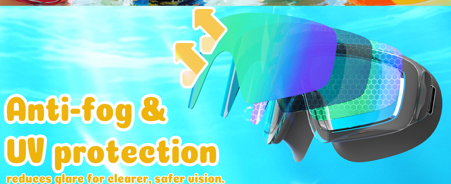 【Anti-Fog & UV Protection】Swim goggles kids feature an advanced anti-fog coating, ensuring kids always enjoy clear vision underwater. The PC lenses also provide UV400 protection, effectively blocking UVA and UVB rays — protecting young eyes from the sun's hidden dangers. *Please do not wipe the inner side of the lenses, as this may damage the anti-fog coating and reduce its effectiveness.