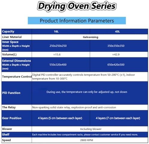 * WIDE APPLICATION:Two-speed design, low-carbon and energy-saving, thick insulation layer, reduce heat loss, increase insulation performance, and reduce machine power consumption. Digital drying ovens are widely used in laboratory test drying, heat treatment and heating in industrial and agricultural production, scientific research.