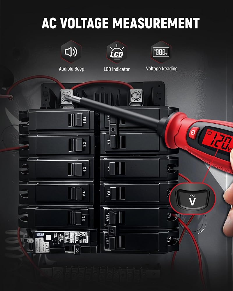 【Safer Checks Without Direct Contact】Use non-contact detection to identify live wires before touching exposed conductors. Simply bring the tip close to outlets, wires, or breaker panels to detect voltage presence. Audible buzzer and LCD indicator provide instant alerts, helping you quickly locate energized areas during inspections, maintenance, and repair work.