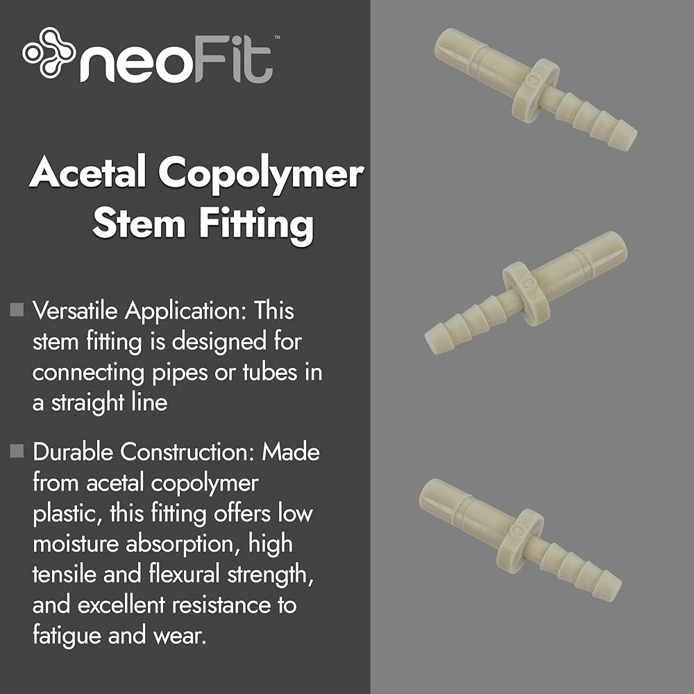 This acetal copolymer stem fitting is a practical and reliable solution for connecting pipes or tubes in a straight line, particularly in fluid handling and plumbing systems that require consistent performance and durability. It features a combination of stem and hose barb connectors, making it easy to insert into flexible tubing and effectively join components with different end types. Manufactured from high-quality acetal plastic, this fitting is designed to withstand various operational demands due to its low moisture absorption, excellent tensile and flexural strength, and resistance to fatigue. These properties make it suitable for long-term use in both residential and commercial settings. In plumbing and fluid transfer applications, fittings such as this are critical for joining lines, redirecting flow, or terminating pipe runs securely. The durable construction ensures that the connection remains stable under pressure, while the versatile design allows for compatibility with a range of tubing materials. Whether used in water filtration systems, beverage equipment, or general plumbing installations, this stem fitting supports efficient system operation and reduces maintenance needs over time.