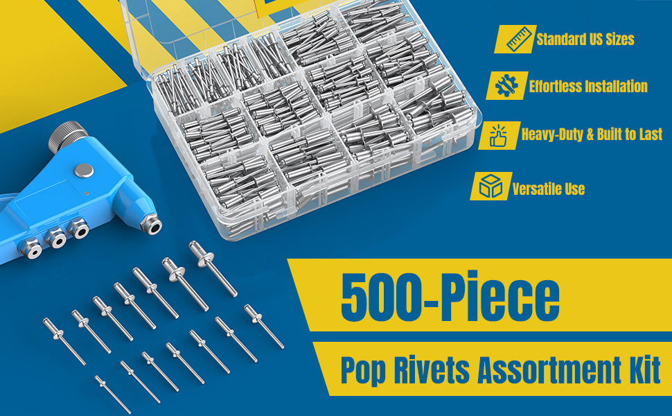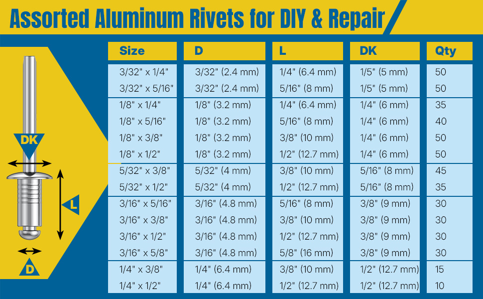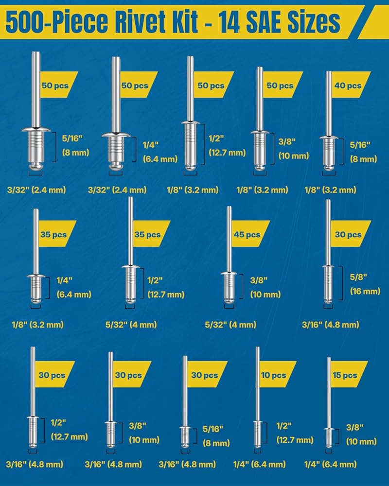 Complete 500-Piece Rivet Kit: Include 500 aluminum rivets in 14 assorted SAE sizes, covering the most common diameters such as 3/32", 1/8", 5/32", 3/16", and 1/4" and multiple lengths. An all-in-one solution for everyday repairs and DIY projects