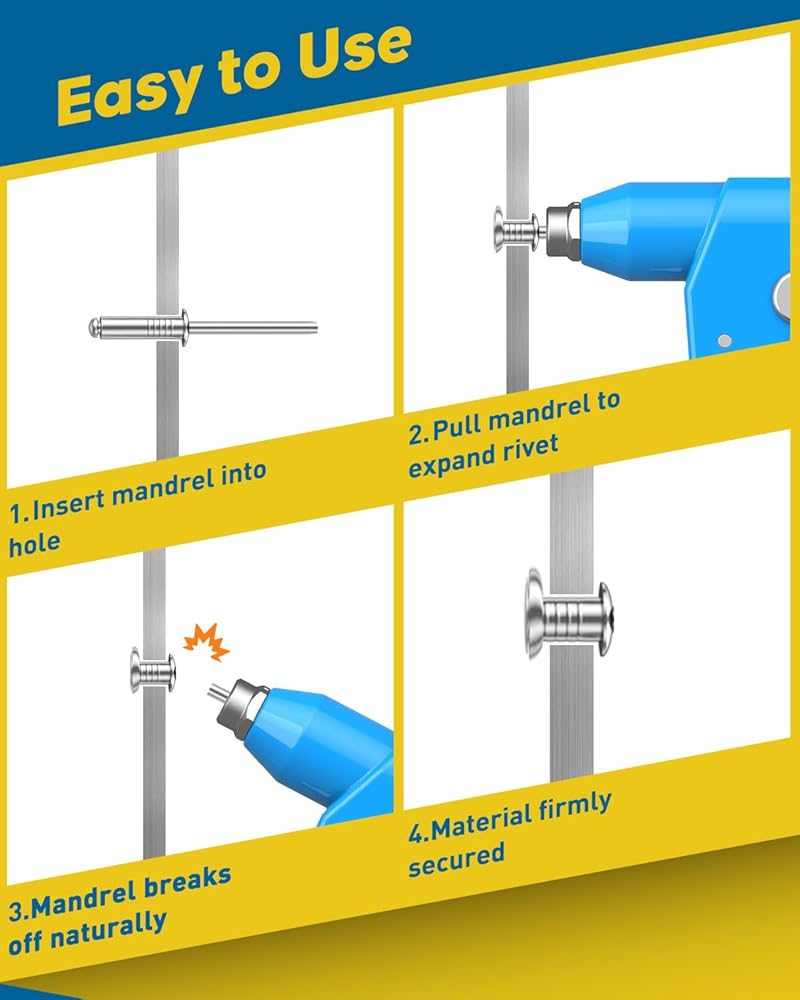 Reliable & Long-Lasting: Built with heavy-duty aluminum and steel, the blind rivets deliver outstanding strength, resist deformation, and provide rust and corrosion protection—ensuring long-lasting durability for consistent repair and assembly performance