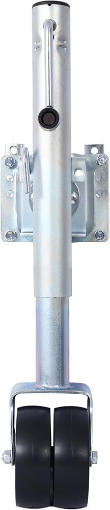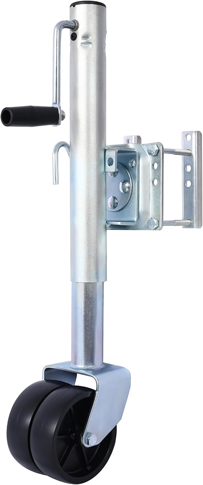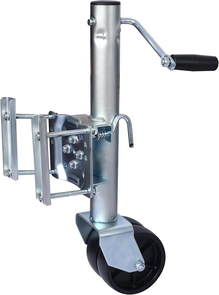 1. Superior Durability: Crafted from robust alloy steel with a galvanized finish, our trailer jack offers reliable support and exceptional resistance to corrosion in diverse environmental conditions. Unmatched Load Capacity: Boasting a lifting capacity of 1,500lbs, our trailer jacks are not only dependable but also capable of enduring heavy loads from boats, RVs, and trailers with ease. Ergonomic Sidewind Handle: The thoughtfully designed handle ensures maximum comfort, facilitating quick and effortless vertical lifting or lowering of the trailer tongue jack by up to 12 inches. With a retracted length of 24” and an extended length of 34.5”, it's designed for convenience. Dual-Wheel Design: Featuring two 6” wheels, our trailer jack provides exceptional stability and effortless maneuverability across various terrains, ensuring ease of use and reliability. Easy Installation and Adjustment: This bolt-on trailer jack is designed for hassle-free installation and swift adjustment to your preferred position, thanks to the swivel bracket feature. Simply pull the bolt and rotate the bracket to achieve the desired setting.