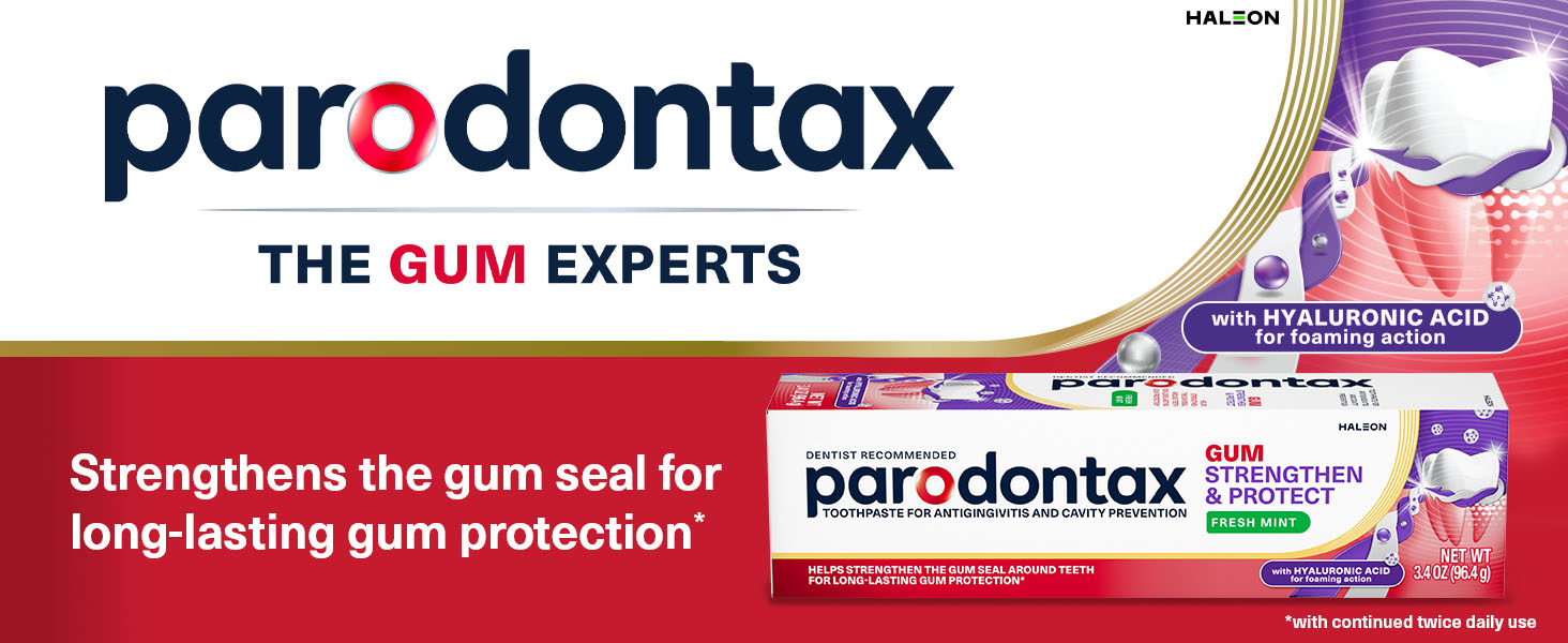 parodontax Gum Strengthen and Protect Fresh Mint Toothpaste strengthens the gum seal around teeth for long-lasting gum protection with continued twice daily use. Its formula is designed by parodontax, the gum health experts, and contains a clinically proven gum health protection ingredient for long-lasting, healthy gums and strong teeth. Healthy gums form a strong and tight seal around teeth. When plaque bacteria builds up along the gum line, this can loosen the gum seal and lead to gum problems. This gum health toothpaste strengthens by killing plaque bacteria along the gumline for a stronger and tighter seal between gums and teeth and this gum health toothpaste protects by helping prevent plaque bacteria build-up to maintain healthy gums every day (1). With Hyaluronic Acid for foaming action, this fluoride toothpaste also freshens breath with a fresh minty flavor. Take a proactive step towards healthier gums and teeth with parodontax Gum Strengthen and Protect Fresh Mint Toothpaste. Try today with NEW parodontax Strengthen and Protect Icy Mint Mouthwash. (1) With continued twice daily use