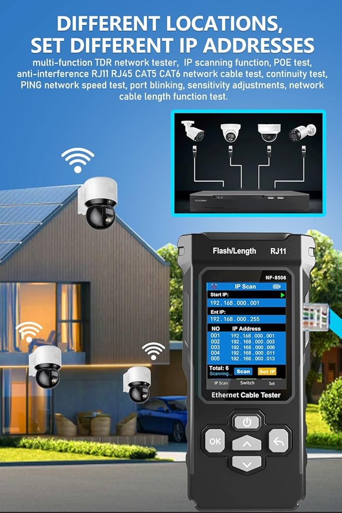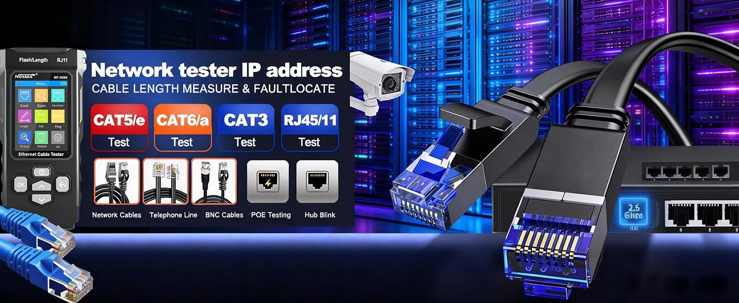 【Multi-functional network tester, supports multiple types of cables】 Say goodbye to the hassle of carrying multiple tools—the NF-8506 can easily handle RJ11, RJ45, CAT5, CAT6, CAT5a/CAT6e/CAT3 shielded cables, and telephone cables. This device can perform connectivity testing, PoE testing, IP scanning, Ping detection, network speed testing, port flashing, and cable length testing, making it an ideal choice for home network setup, office troubleshooting, and engineering cabling. No need to switch tools for different cable types!