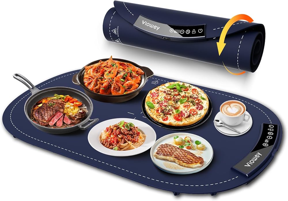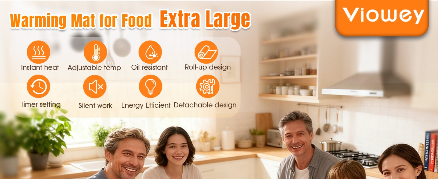 【10s Rapid Full-Surface Heating】Viowey electric warming mat with advanced directional heating technology, with its superior thermal conductivity, the warming tray can quickly heat up in just 10 seconds, providing rapid and uniform warmth across a large surface area. The raised bottom efficiently dissipates heat, protecting your countertop and ensuring you can enjoy the comfort of evenly heated meals in a safe and cozy environment.