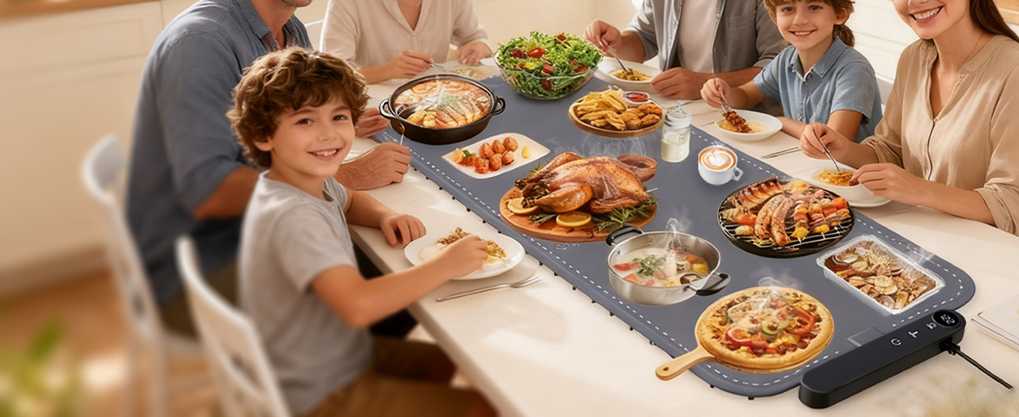 【Adjustable 7 Level Temperature Control】This food warming mat providing 7 temperature levels from 104 ℉ to 212 ℉, meeting various needs such as keeping food warm, defrost, etc. The clear LED touchscreen display and sensitive touch controls make adjusting settings effortless, ensuring every dish is served at the perfect temperature for the duration you need.