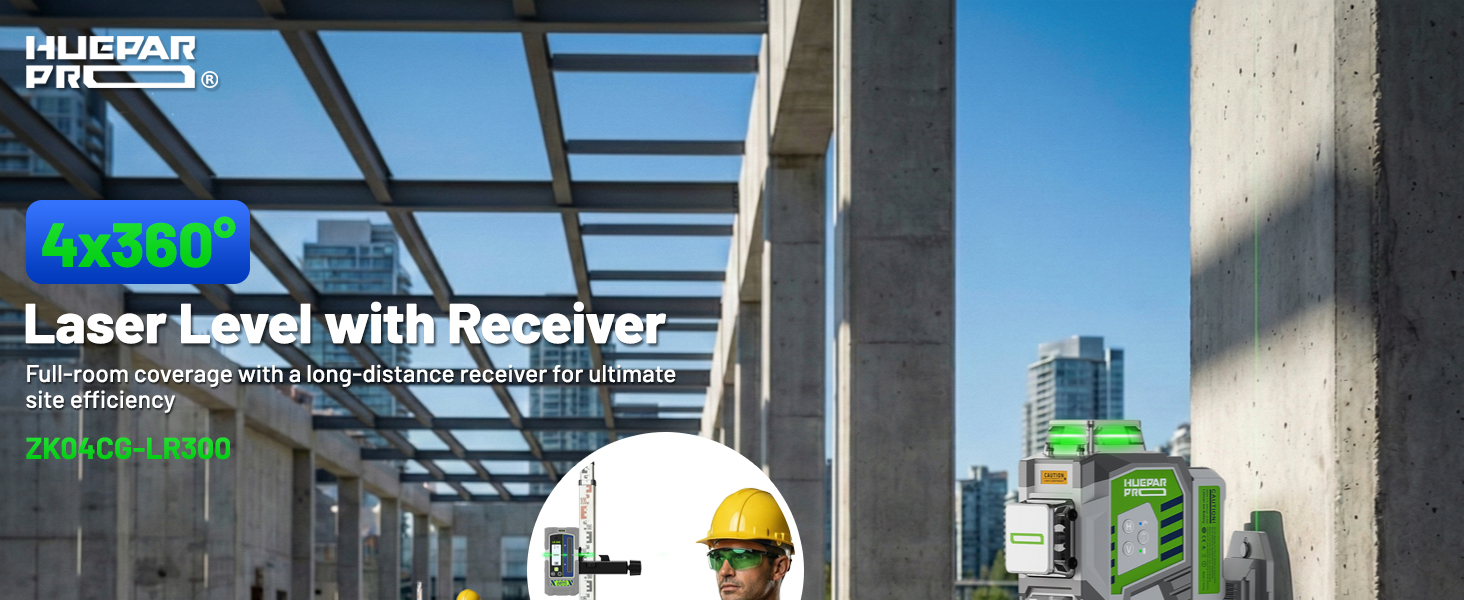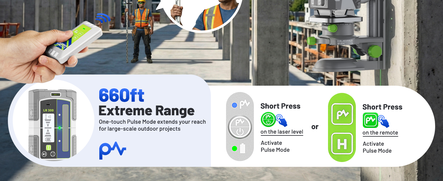 1.【Outdoor Use with Receiver- Works Up to 660 Feet】 This Huepar Pro laser level kit comes with a high-precision receiver that enables a working range up to 660ft in Pulse Mode, making it perfect for outdoor use and long-distance alignment. The receiver features dual accuracy settings — ±1/13" at 33ft for precision work and ±1/8" at 33ft for standard leveling and grading. Easily switch modes to match your task, whether you're framing, pouring concrete, or tackling large outdoor projects