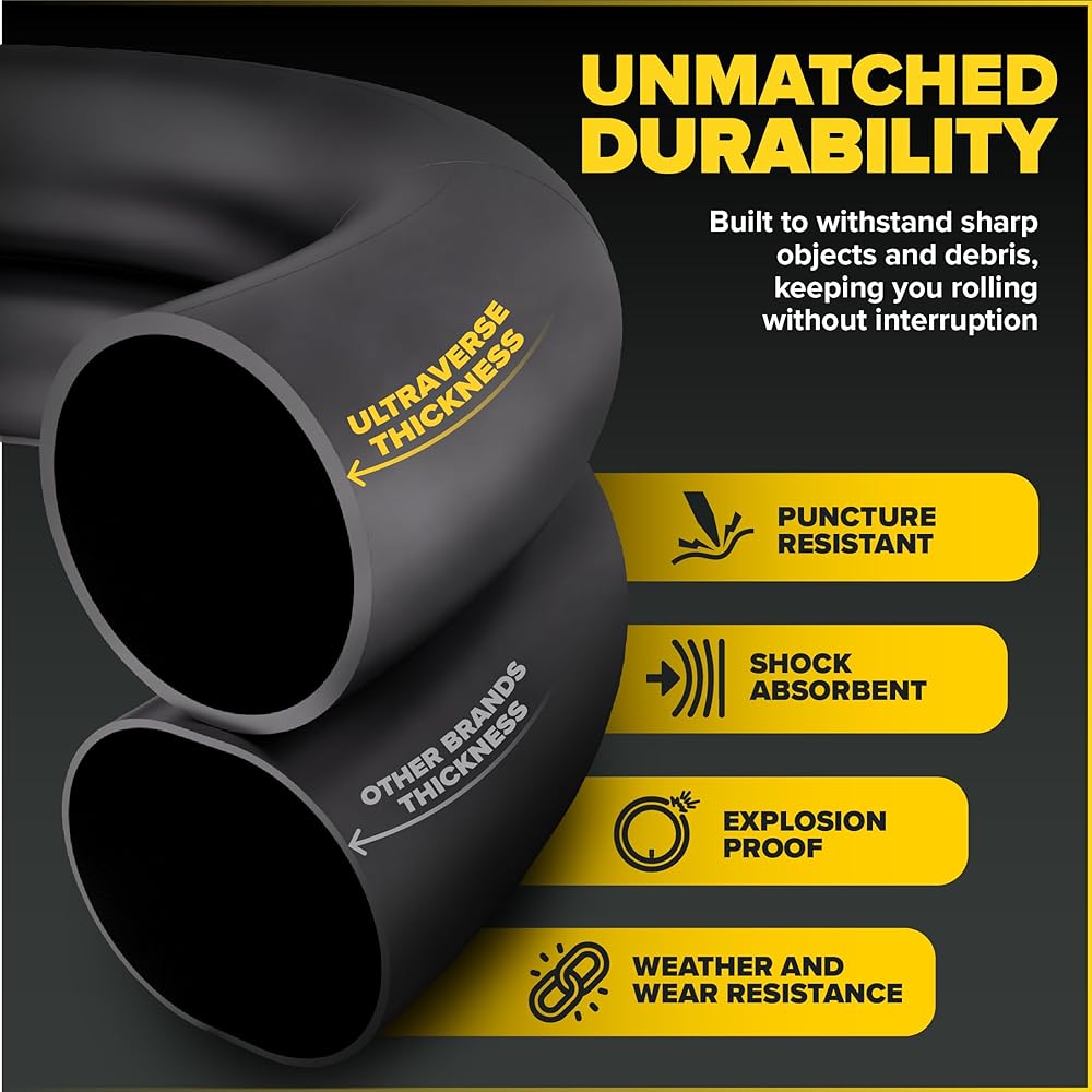 DURABLE & PUNCTURE-RESISTANT DESIGN – The thick butyl rubber body withstands friction, heat, and road wear better than standard tubes. Built for long rides and rough terrain, it extends tube lifespan and lowers replacement and maintenance costs.