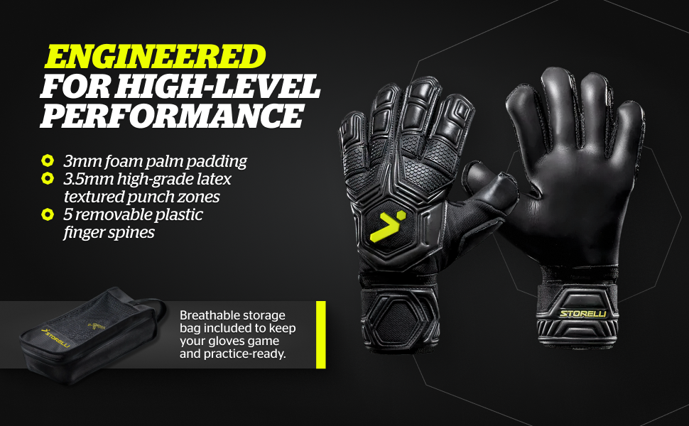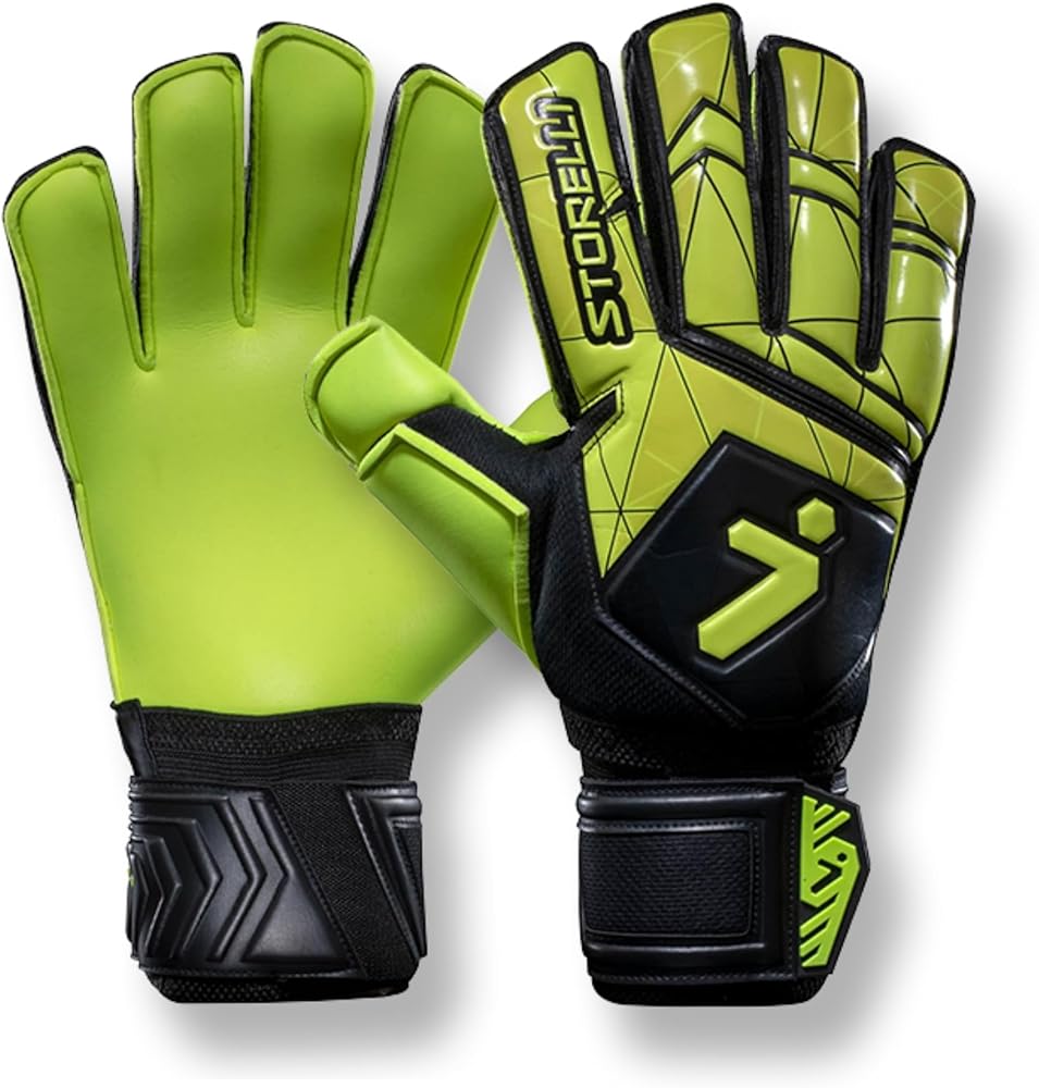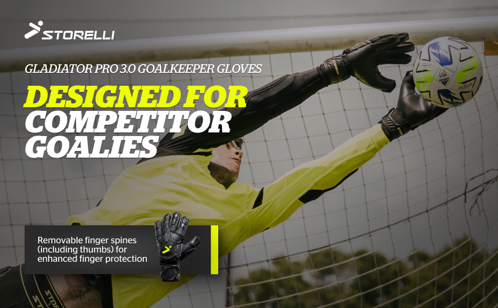 "The Storelli Gladiator Recruit 3.0 Goalkeeper Gloves are the best in high-performance finger protection and superior grip for entry-level soccer goalies. No matter what stage you're in–whether you're a pro or a beginner–the right hand protection is essential in your sports kit. Featuring 3.5mm of New Basic German premium latex, these entry-level gloves ensure palm protection and a strong, tacky grip. The gloves feature a padded backhand that absorbs impact when punching the ball, protecting your hands when they need it most. These comfortable goalkeeper gloves include 4 built-in plastic finger spines that reduce the risk of injuries such as bent or jammed fingers. They have a flat palm cut and a full wrist wrap with double velcro touch point to give hands added comfort and security. Play all day with these breathable gloves, designed with mesh fingers and backhand gussets to ensure optimal performance in all conditions. The included breathable glove bag keeps your gloves fresh all day and provides a convenient storage solution for travel on game day and training. The Storelli Gladiator Recruit 3.0 Goalkeeper Gloves come as 1 pair (2 gloves) in black/ yellow and are available in sizes 4-10. The gloves have a hook and loop closure and are made with latex, polyester, PP, EVA, and nylon materials. "