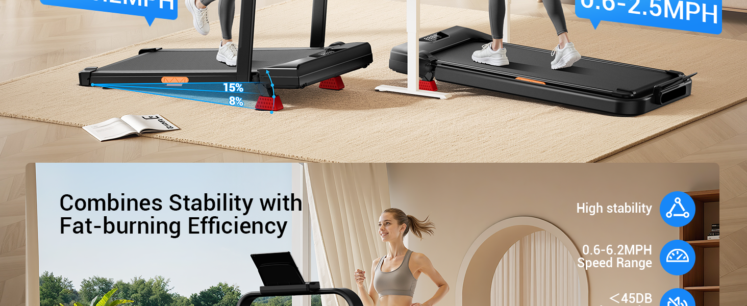 Versatile Incline Treadmill for Home Fitness: Enhance your workout intensity with our walking pad treadmill, featuring an 15% manual incline that simulates uphill training. This 3-in-1 machine combines walking, light running, and incline exercise in one compact unit. It's a space-saving all-in-one home fitness solution with a robust 300 lbs weight capacity